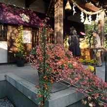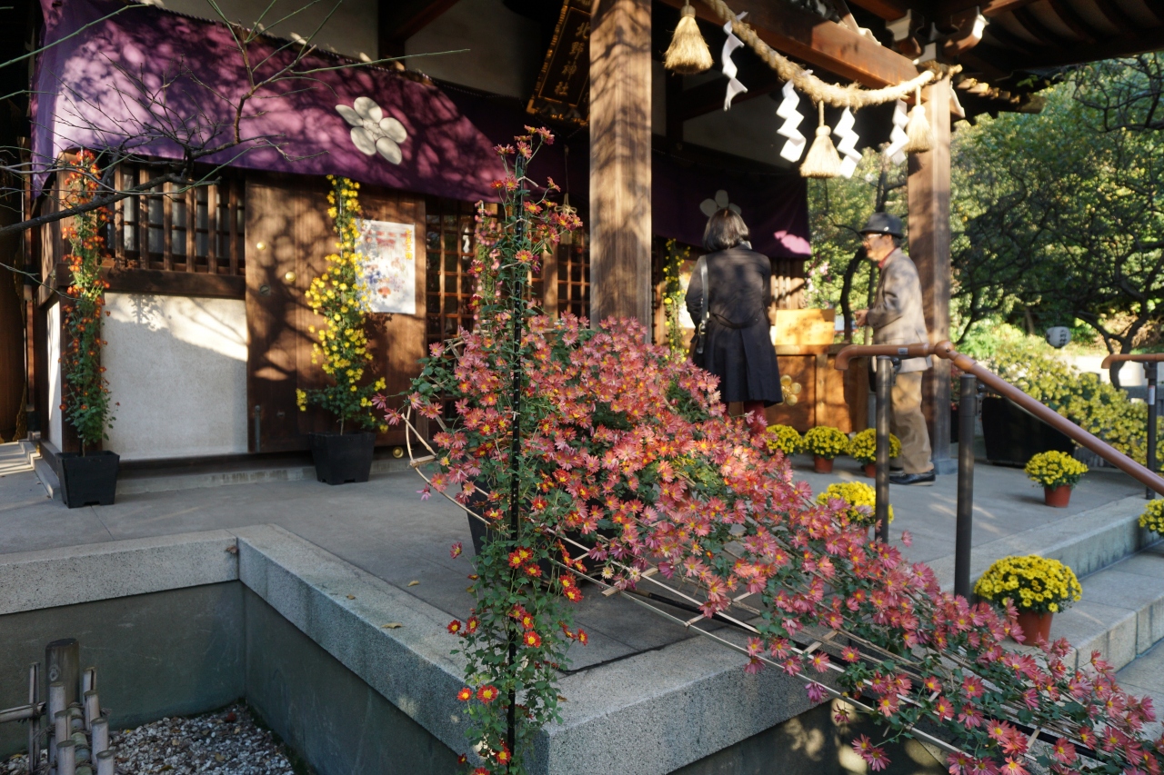 牛天神北野神社では、ちょうど、菊わらべまつりをやっていました。参道の石段から黄色い菊の鉢が並んで、本殿の周辺にも、懸崖や嵯峨菊のような仕立ての菊が飾られて、規模は小さいので派手さはありませんが 、繊細な飾り付けがちょっと心に響きました。すばらしいと思います。