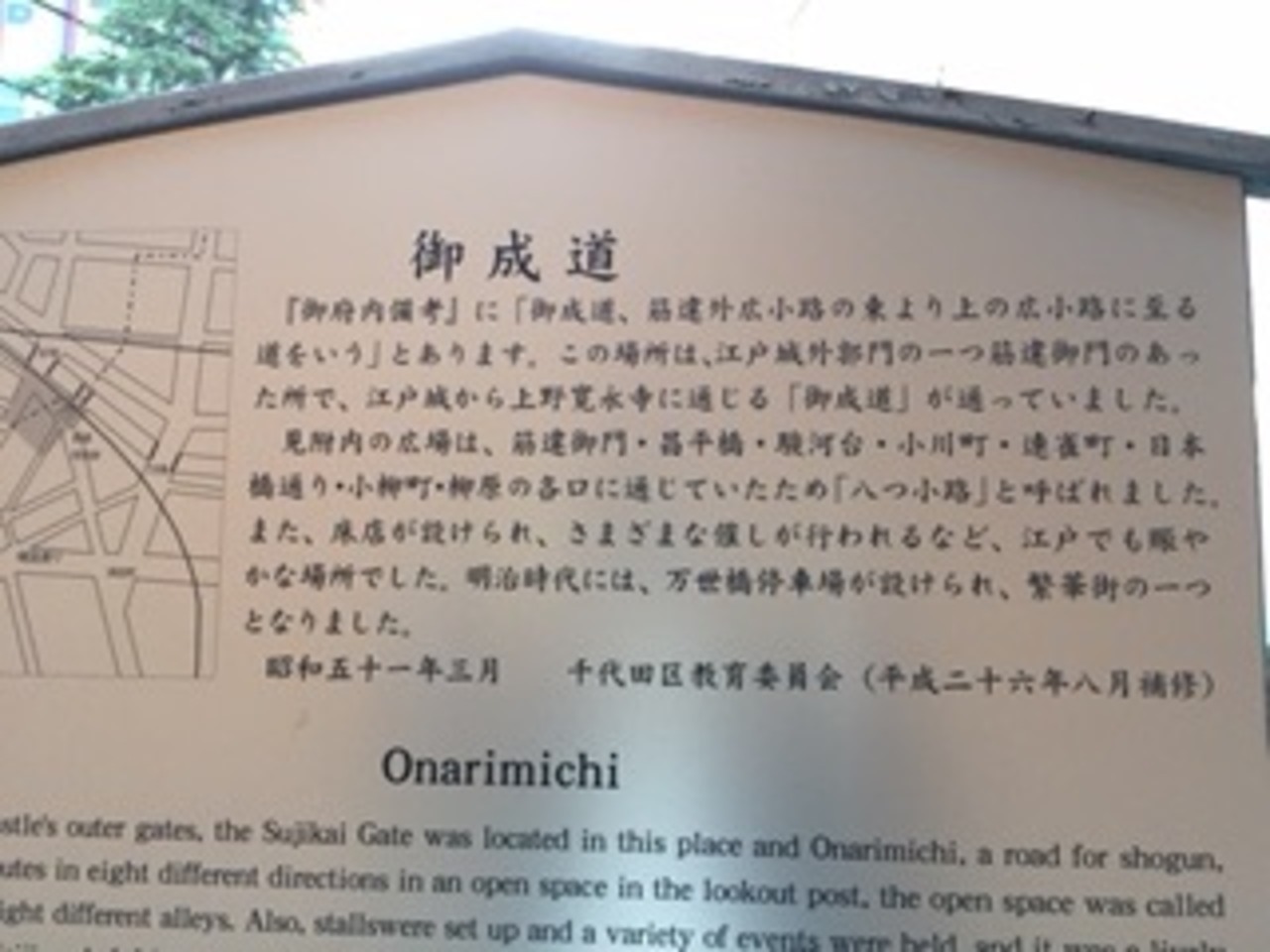秋葉原駅電気街口から、万世橋を渡り、マークエキュート万世橋に沿っていくと、説明板があります。将軍が、上野寛永寺に参詣する際に、必ず通るため、御成道と呼ばれたそうです。そのため、このあたりは、当時、大変に賑わっていたそうです。