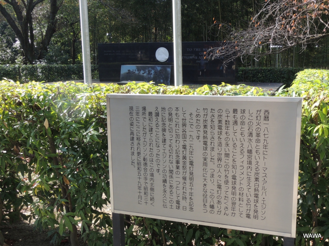 エジソン記念碑は、電球フィラメントに使った八幡の竹に由来し石清水八幡宮駐車場付近に建つ記念碑です。子供の頃にエジソンの伝記を読んだ時から、実用化に向けた幾度もの実験の末に京都の竹が最適だったことは知っていましたが、偶然にも記念碑があることを知り感動しました。
