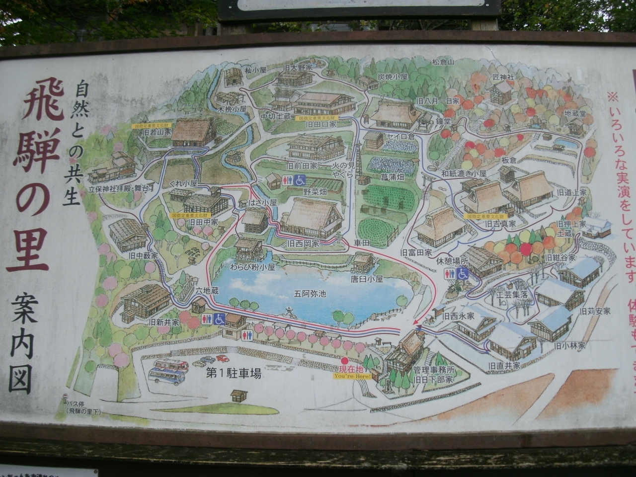 里山の豊かな自然の中、園内には大きな池を囲むように20軒ほどの掌造りや萱葺きなど飛騨地方の特色のある民家が並んでいて、昔の農村の雰囲気を形作っています。