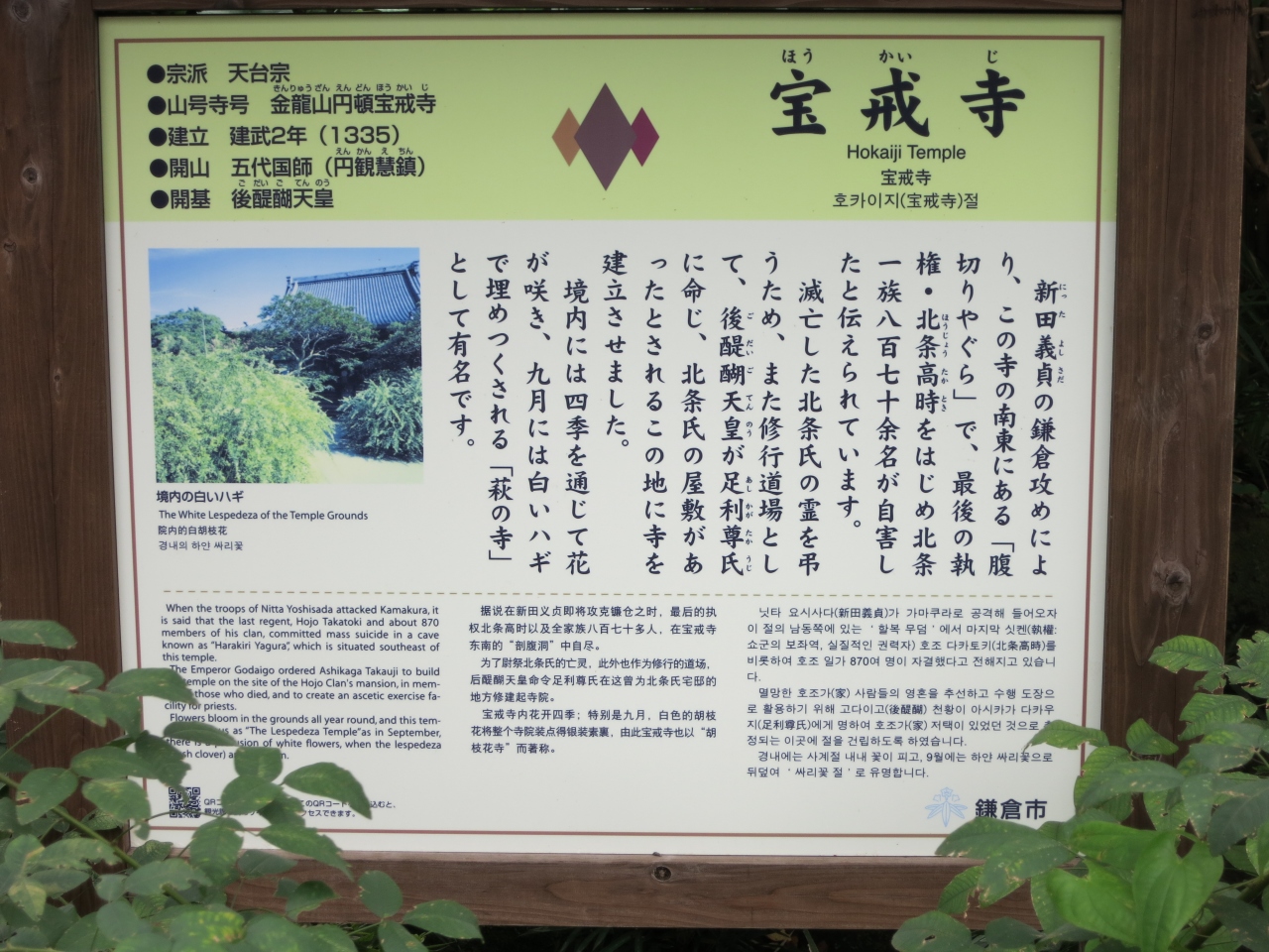 鶴岡八幡宮から鎌倉街道を東に向かうと一端北に折れます。その北折れの先に金龍山 宝戒寺があります。鎌倉幕府執権の屋敷地跡である宝戒寺は、萩の花が有名と聞き立ち寄りました。