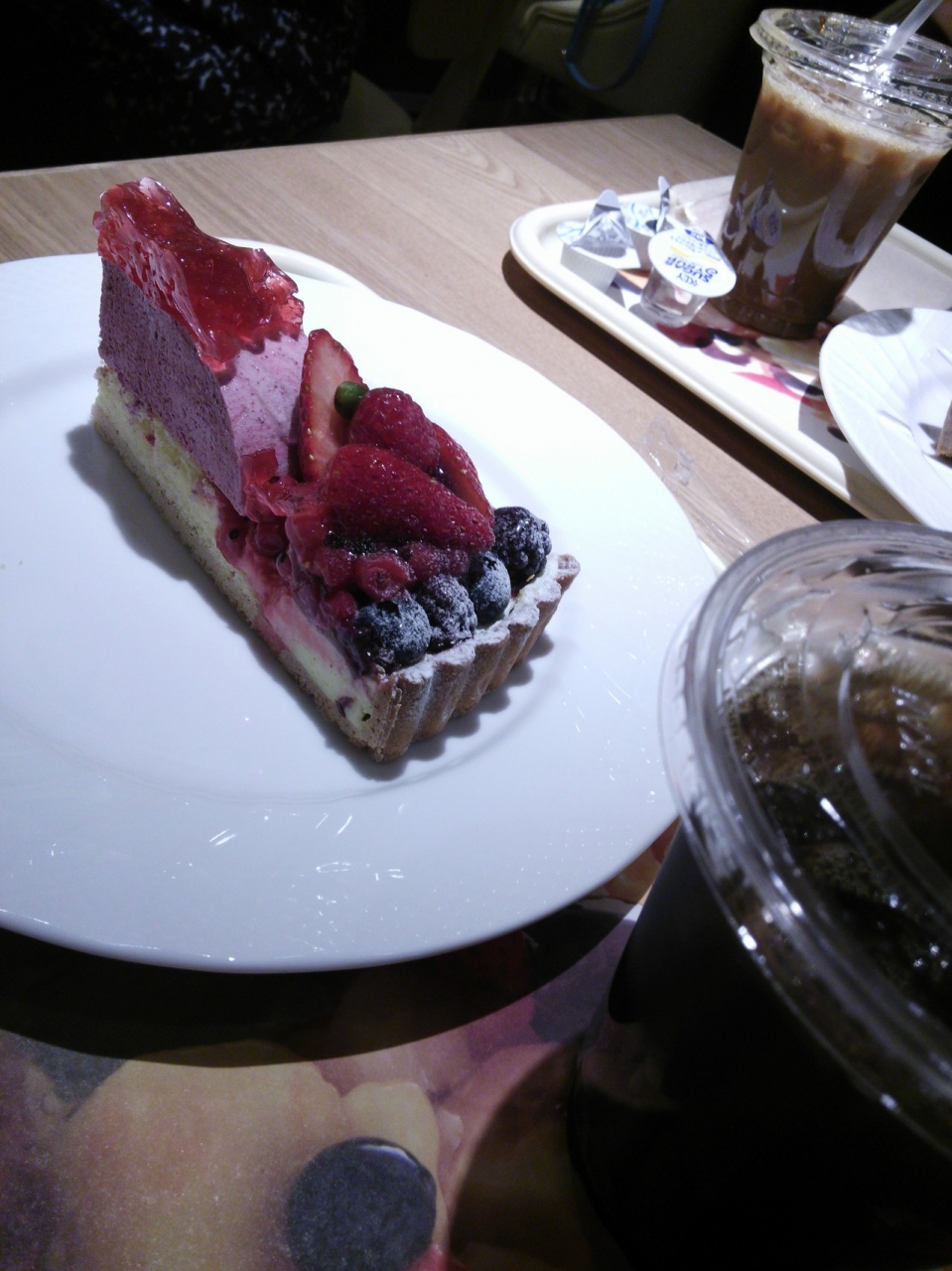 デリスの入口にはフルーツのタルトが並び、思わず足を止めました。ケーキセットもお手頃料金なのでお茶することにしました。ただしセルフなのでレジで注文し商品を受けとって席を探しました。席数も多いのですがほぼ満席のようでした。