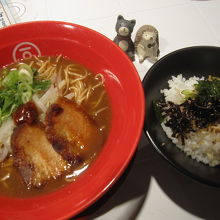 お店一オシの醤ラーメンと、いりこぶしと小豆島の佃煮がのった島めしのセットを食べました。