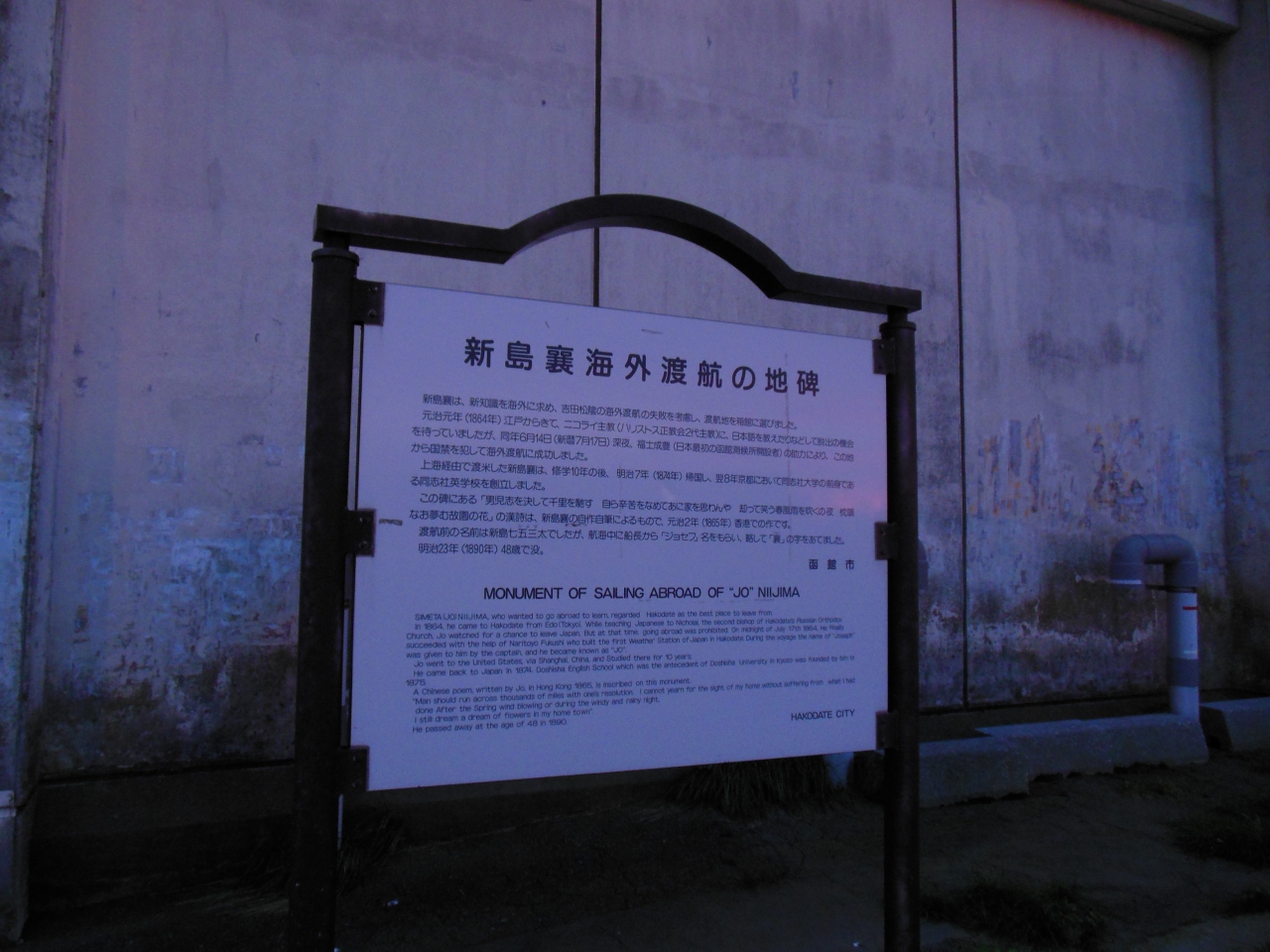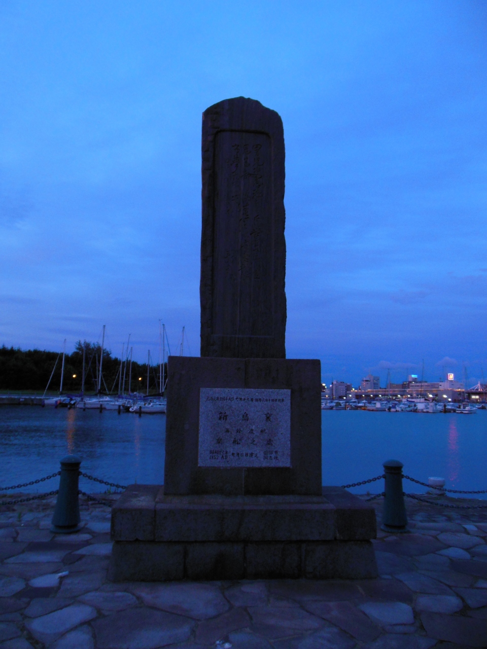人気のない海際で、とてもひっそりしています。夕暮れ時だったのでまるでお墓のような写真になってしまいましたが、新島襄という有名な人の碑だったのですね。