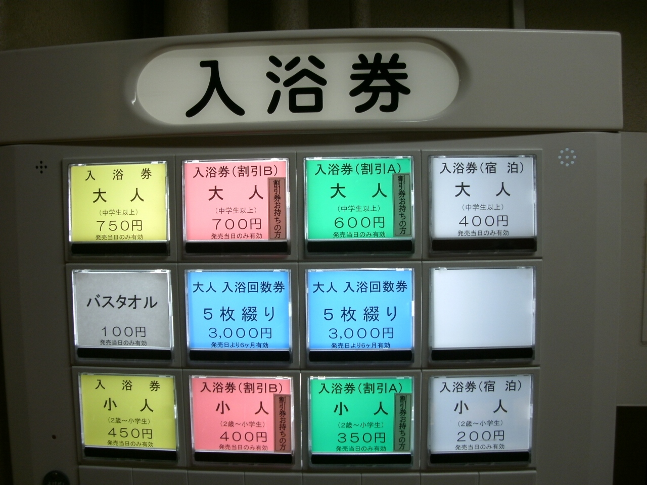 入り口の自販機で入浴券を買って入ります。タオルは1本貸してもらえるので、事前に何も準備しておく必要はありません。お風呂は普通の銭湯と言う感じで、シャンプー、リンス、石鹸、ドライヤーは用意されています。