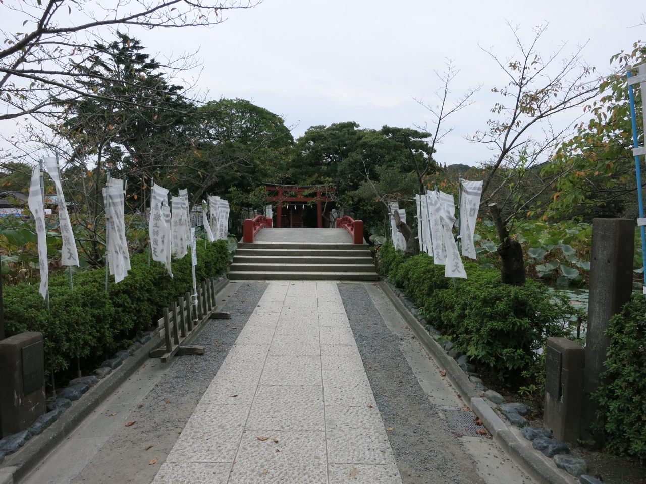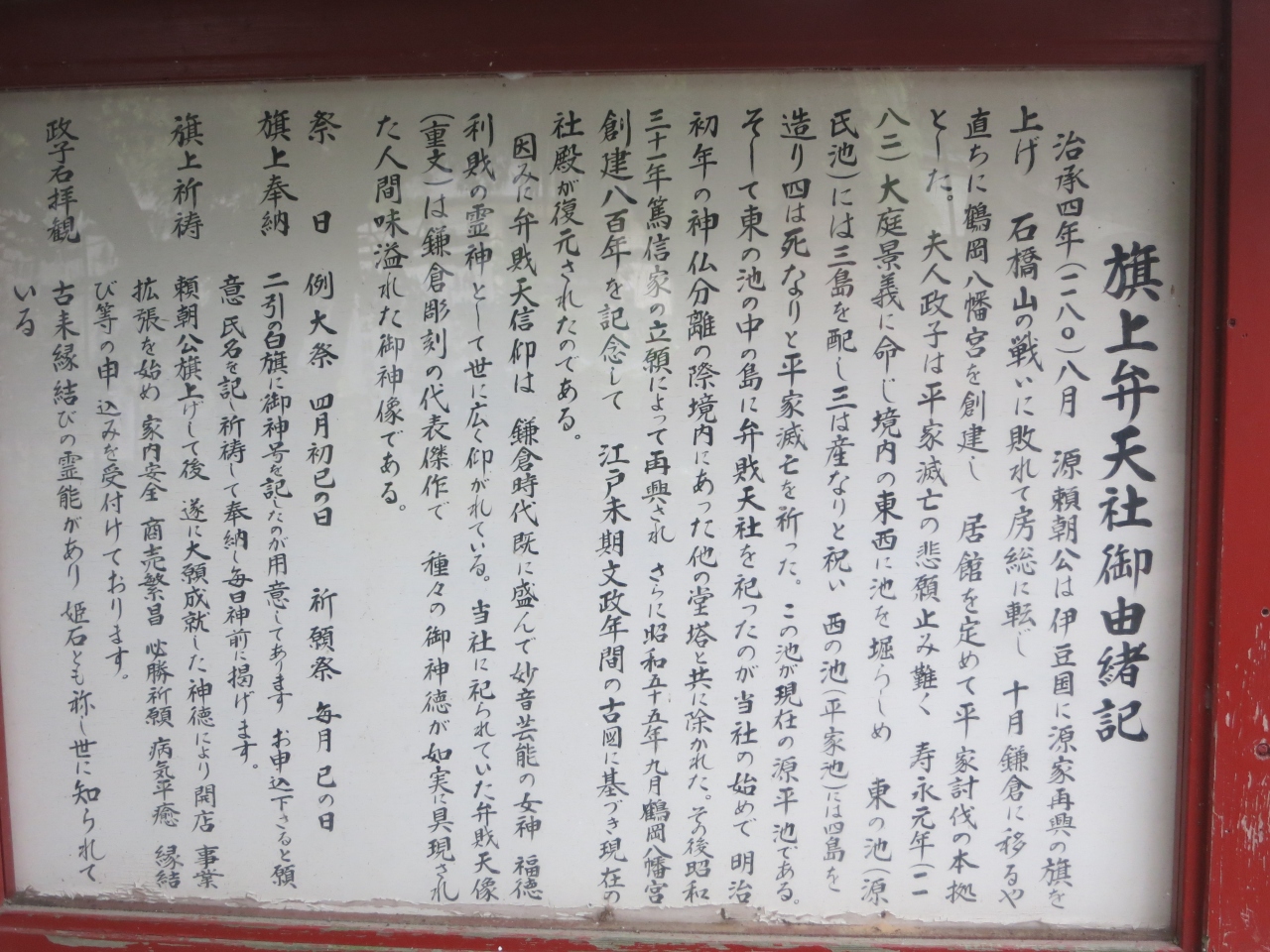 源頼朝が旗揚の際に信仰したと言われる弁財天には、奉納あれた数多くの二引きの白旗が並んでおり見事。源氏ゆかりの弁天様だと言うことが良くわかります。
