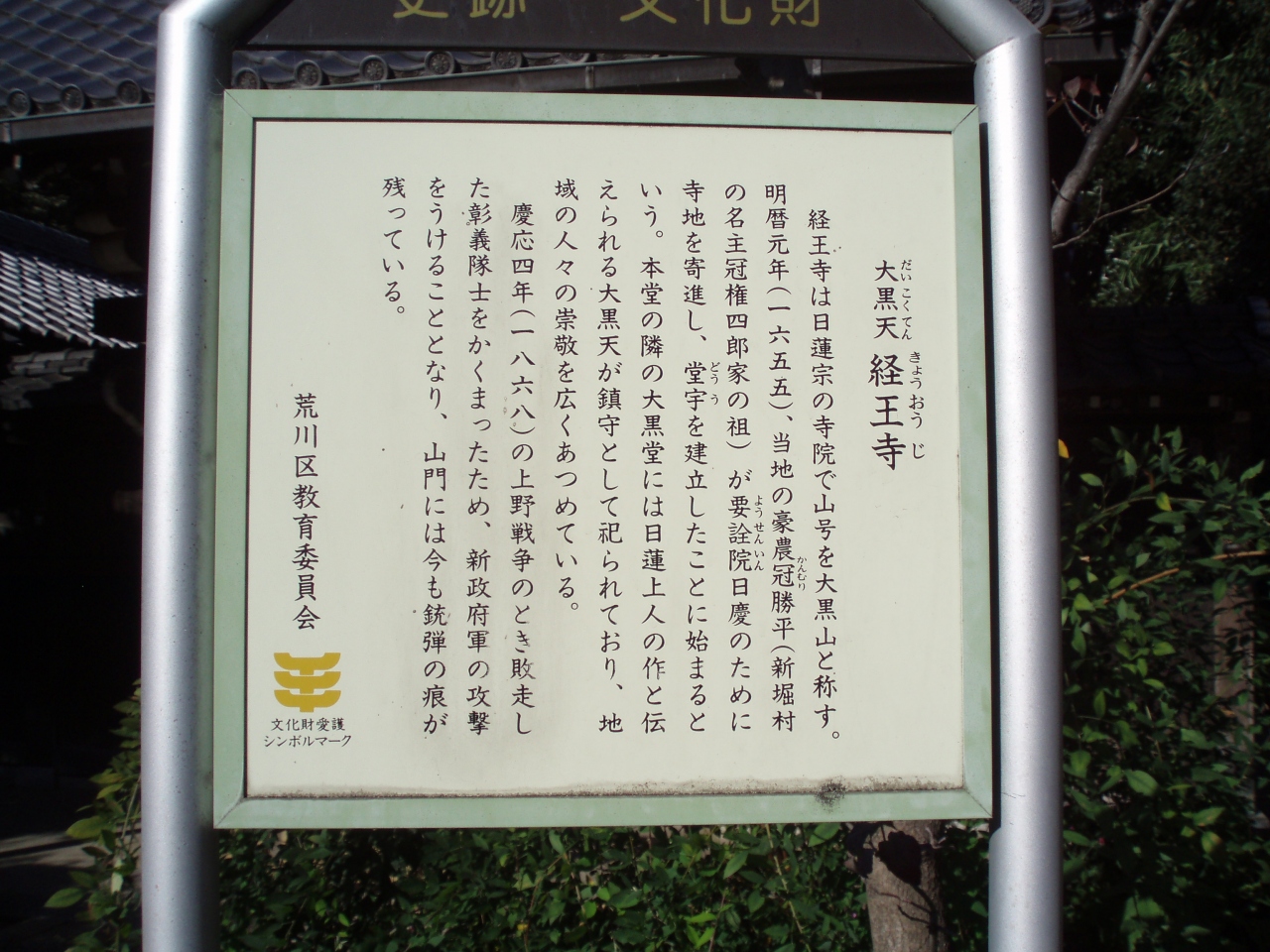 JR日暮里駅から谷中銀座商店街方向へ行く途中に右手に江戸幕末上野戦争で敗走した幕府軍をかくまって新政府軍の攻撃を受け山門に弾痕が残っている経王寺に着きます。経王寺は日蓮上人が自ら彫ったという大黒天像とそれを安置する大黒堂があります。境内は広く静かで綺麗に整備され寺雰囲気を充分に味わえ、商店街の賑わいで疲れた身体を癒してくれ休憩しながら歴史を感じられます。