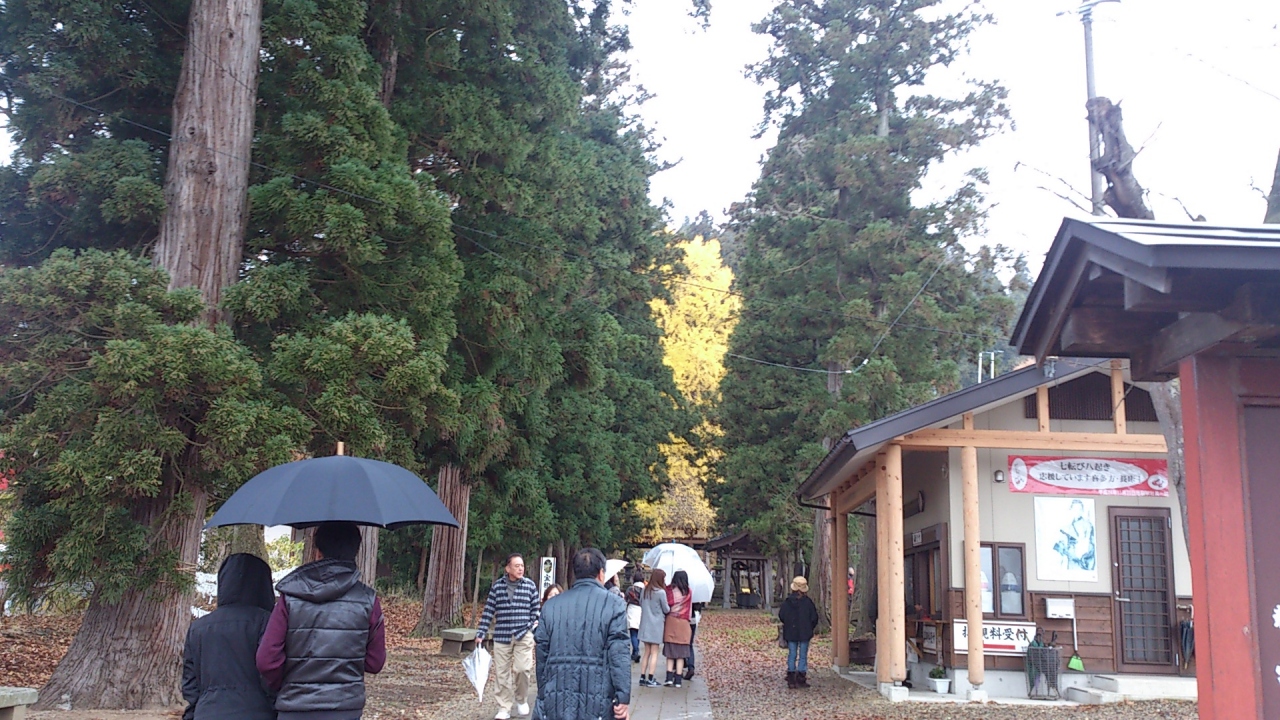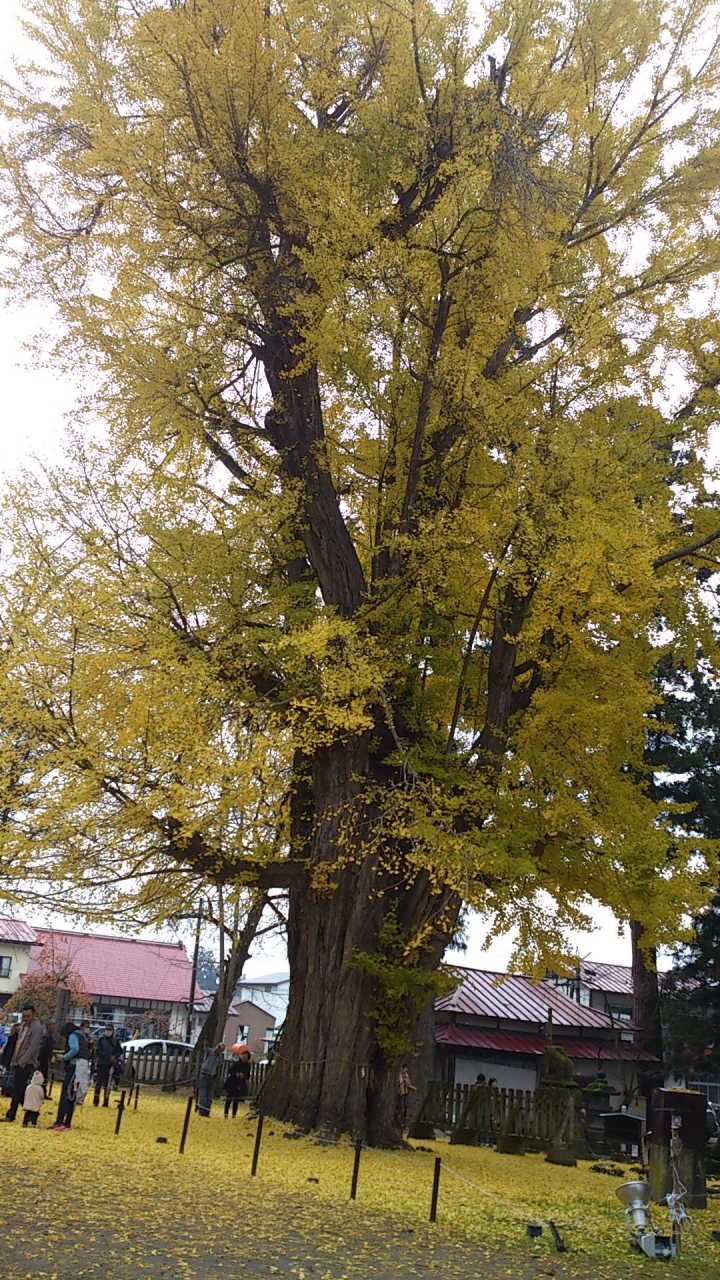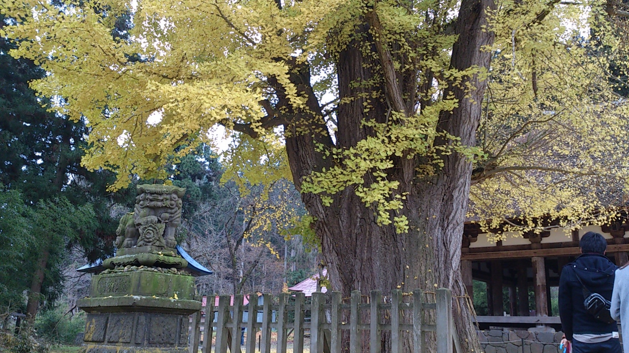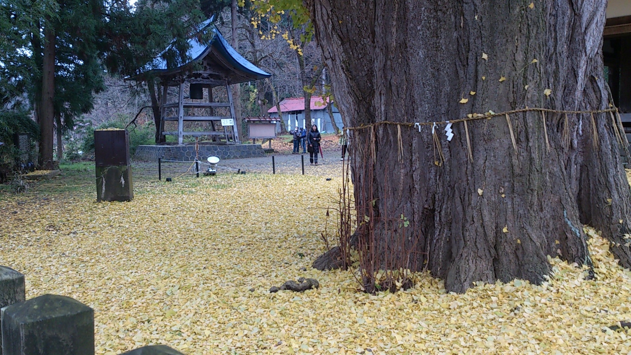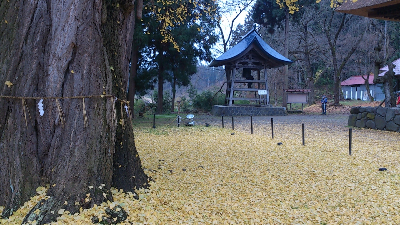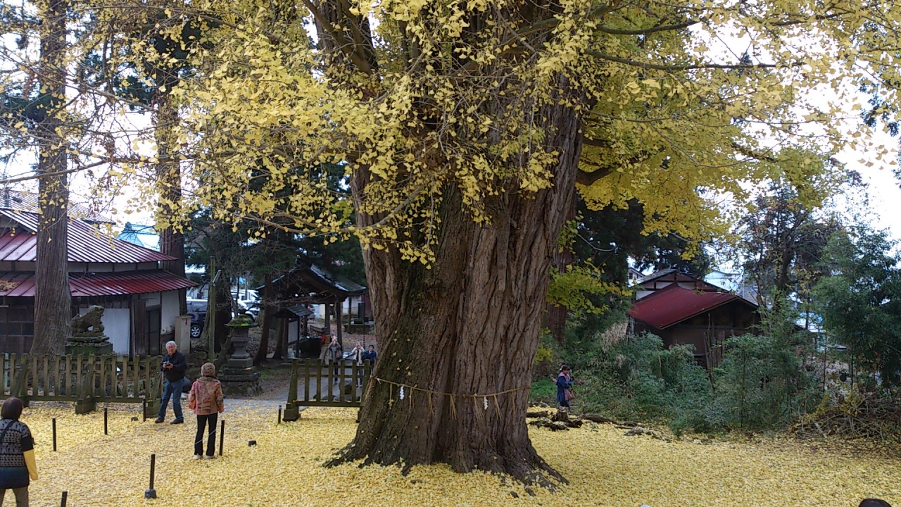 喜多方の市街地より南西方向へ約10?行くと「新宮熊野神社」が現れます。ここは、長床と呼ばれる拝殿、根本周り8mの大イチョウで有名です。樹齢800年の案内板があり、それは見事な黄色の世界を造っています。地面が黄色に染まる景色をご堪能あれ。