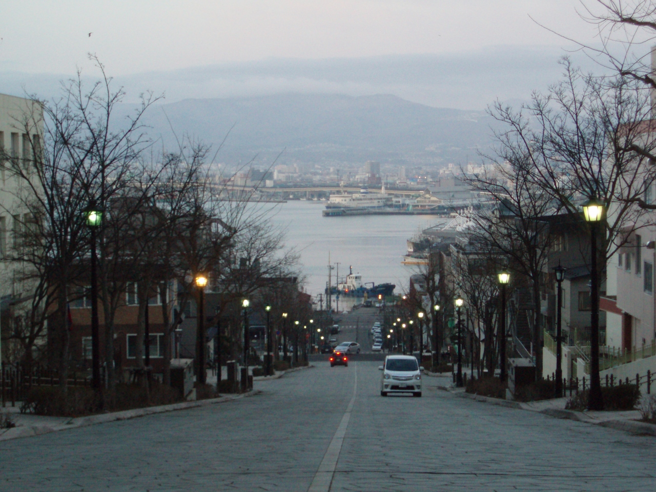道幅が広く両側にはマンションや住宅が建ち並んでいるのですが並木で丁度隠れていい感じに、そして坂の真正面に函館湾の水面が見えます。