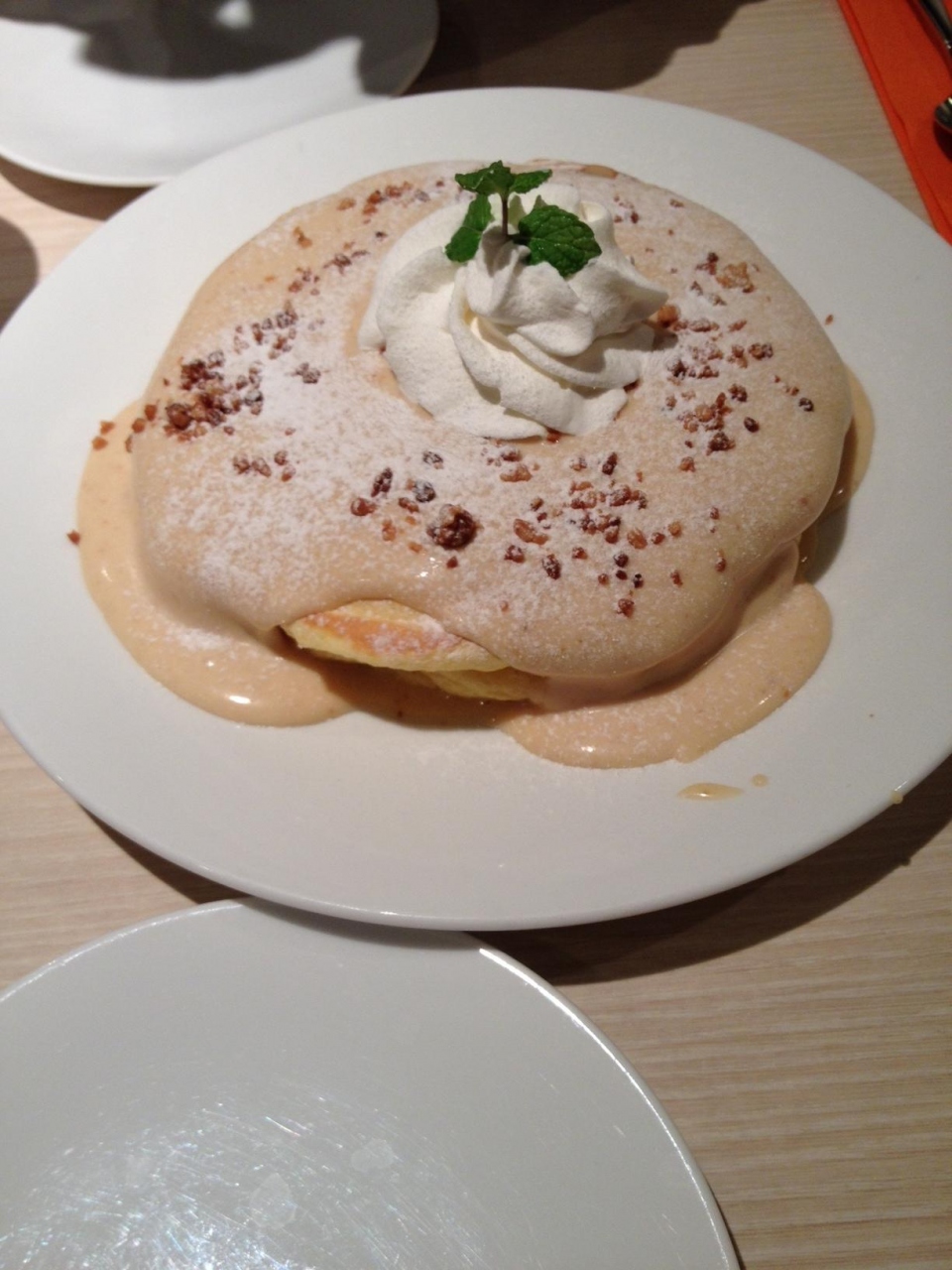 友人と二人で訪れ、マカダミアナッツのパンケーキを半分ずついただきました。ソースがとろっとしていて、時間が経つとどろっと下に落ちていきます。それなので、食事中盤以降はお皿に落ちたソースをすくってつけて食べていました。感想は、甘くて半分がちょうど良かったです。平日の夜で、店内はほぼ埋まっていましたが並ばずに入れるのは良かったです!