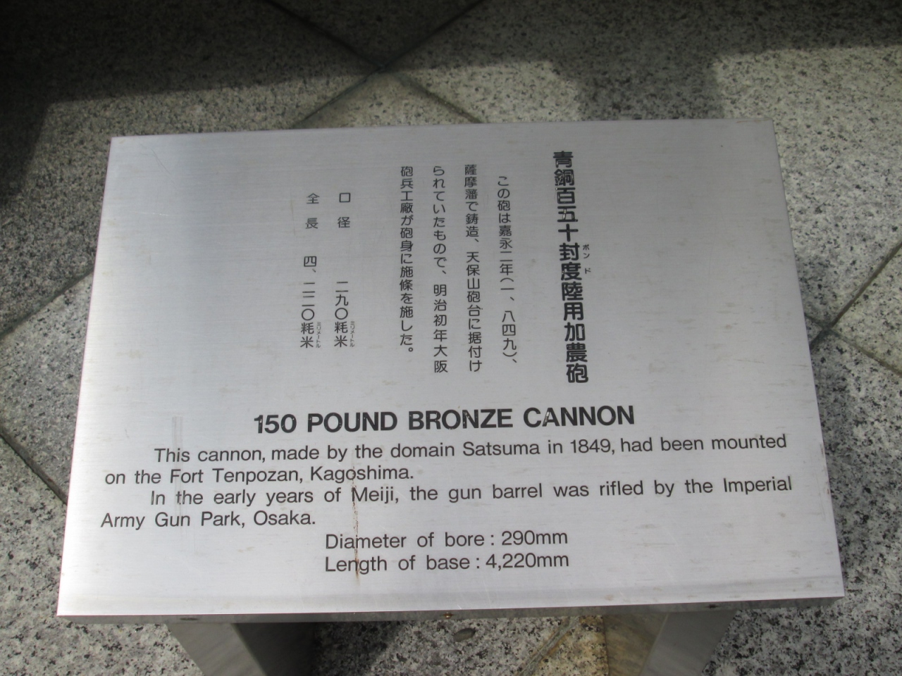 遊就館の敷地に大きな大砲が展示されていました。(館外ですので無料です)説明看板によると、1849年に薩摩藩で造られ、天保山砲台に据付けられていた、大砲とのこと。「加農」は「キャノン」と読むらしいですね。幕末、武器も近代化された様子が伺えます。