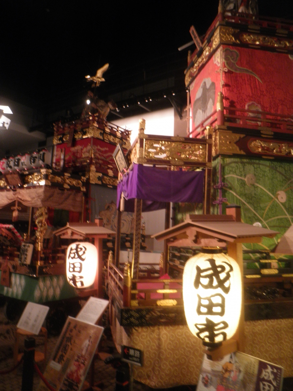 成田国際空港で乗り継ぎ時間が8時間あったので、成田新勝寺の紅葉祭りに行きました。 JR成田駅から表参道を歩いていくと、ウナギの川豊の向かい側にあります。 休憩するところがあって、多くの参拝者が休んでいました。 建物の中に入ると、一番上の階までエレベーターで上って、降りながら展示物をみることができます。 1番下の階には山車が並べてあり、見応えありました。