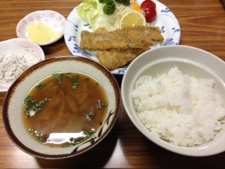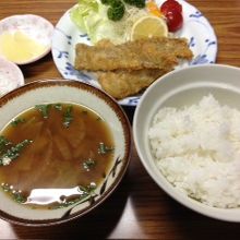 焼津駅の商店街にある昭和の香りが残る大衆食堂。夜8時頃商店街に行くと、ほとんどの店のシャッターが閉まっていた中、運よく開いていたので入りました。おばあさんが1人で切り盛りしてました。メニューは壁に貼ってあり、孤独のグルメにでてきそうな店構え。今回は「かつおのへそ定食」と「太刀魚のフライ定食」を頼みました。ちなみに「かつおのへそ」とは心臓の事らしいです。フライはカラッと揚がっており、味噌汁ご飯も山盛りでお腹いっぱいになります。焼津らしいものが手軽に食べれてよかったです。