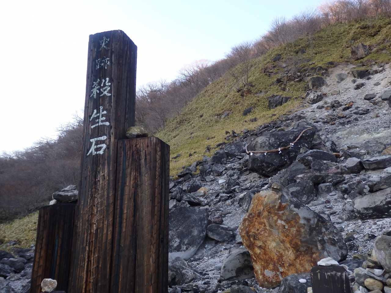 そして、遊歩道の一番奥に、殺生石の看板があり、硫黄の臭いが立ち込める中、こちらもまた不思議な感じがする岩石の数々でした。