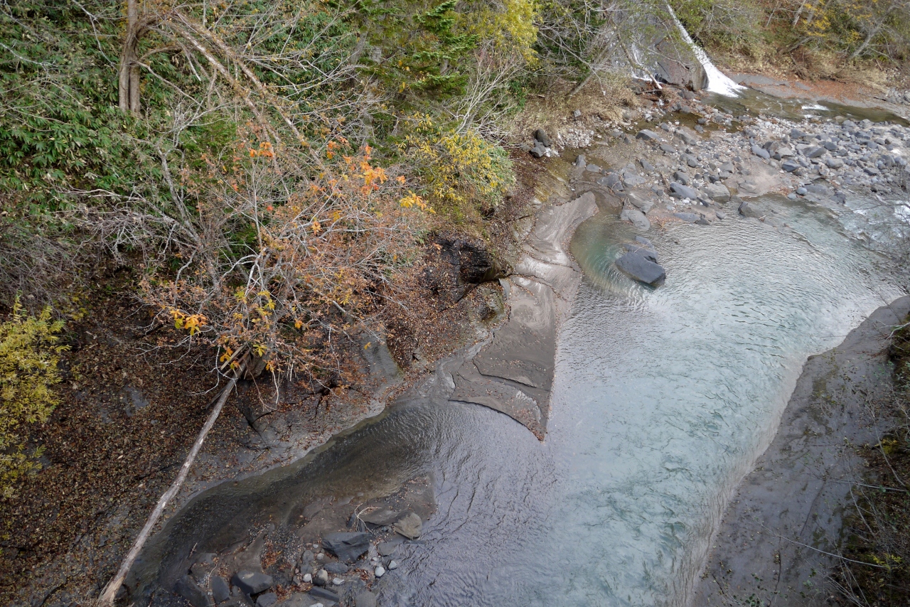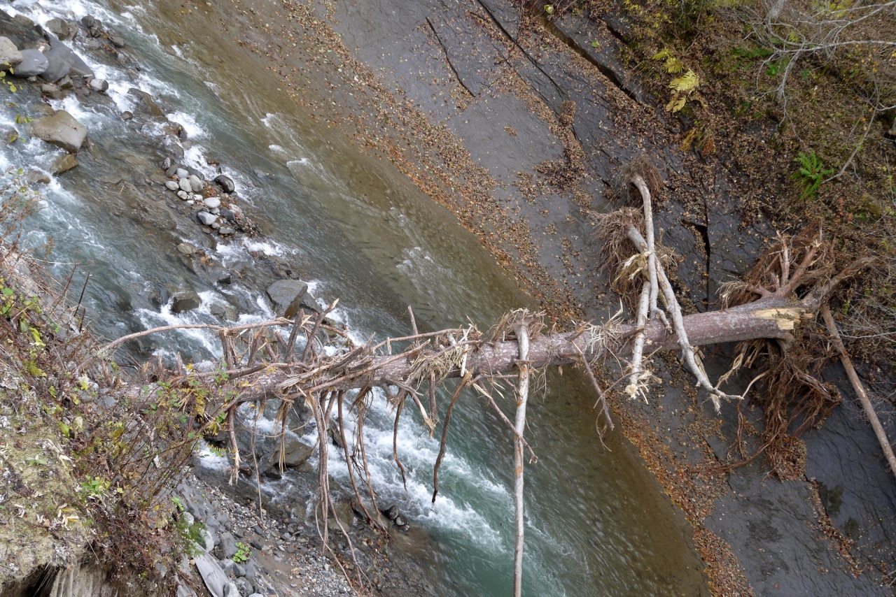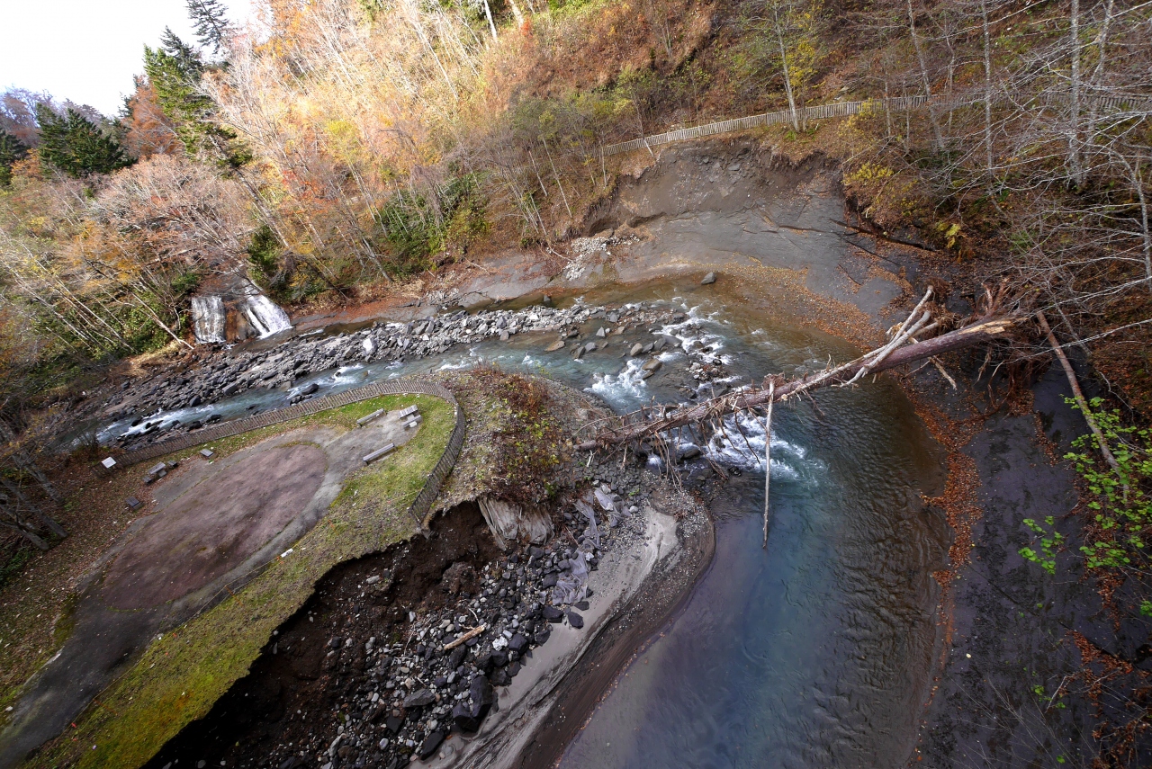 9月11日の水害でなんと人道橋が流れてしまい,ラルマナイ川には降りることができない.遊歩道は通行禁止.すっぽりと削られてしまっている.復旧は2015年春以降だろう.しかし景観はうえから見ることができる.むしろ水害のすごさを感じてしまった.