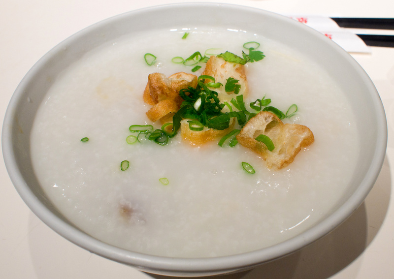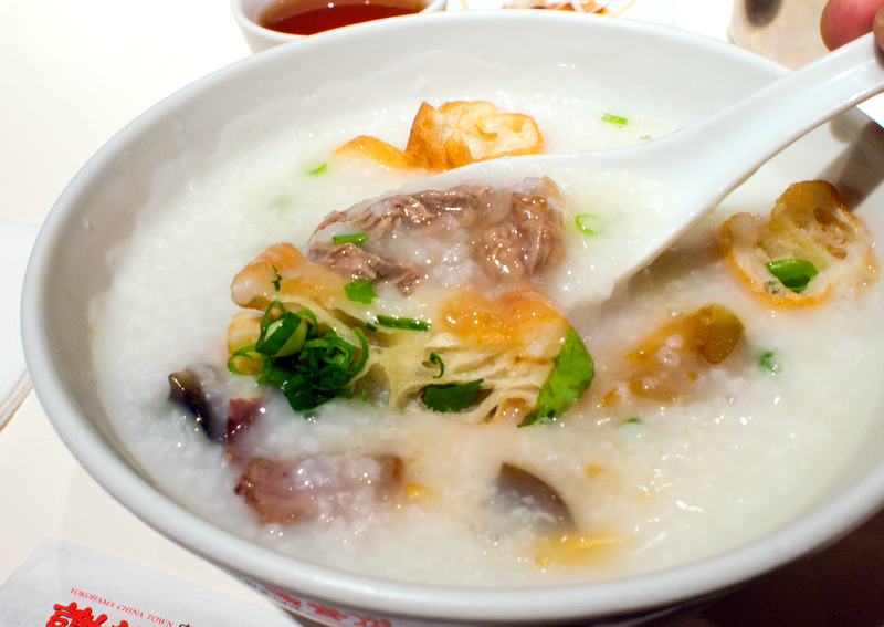 注文したのは「ういかゆ(五味粥)」普通サイズ。上から見えるのは油条(揚げパン)と青葱だけですが、牛肉・豚肉・鶏肉・豚スネ肉・ピータンの5種類の具が、粥の下に沈んでいます。