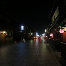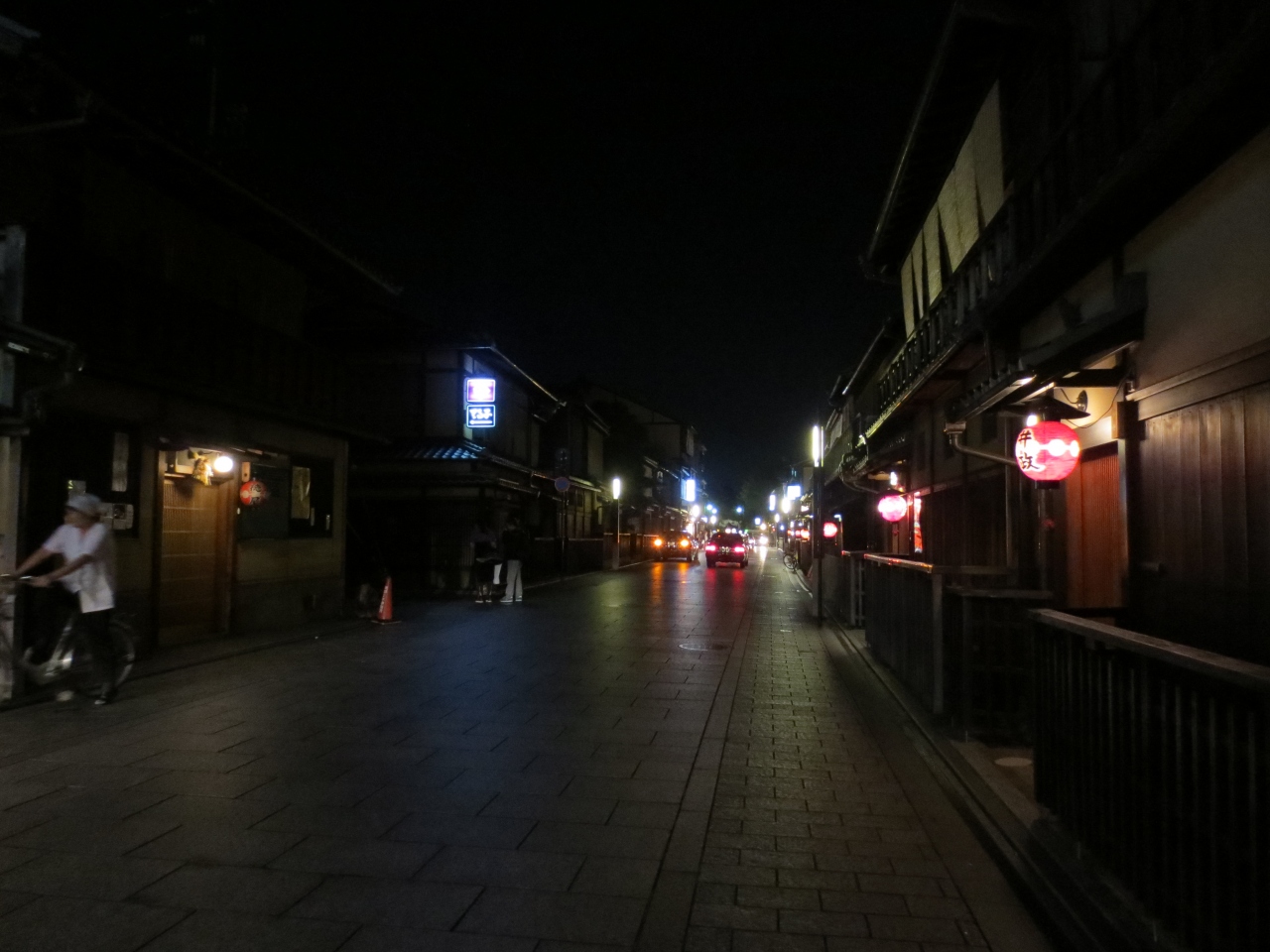 夜の花見小路通りを散策しました。赤い提灯の光が点々と続き京都らしい雰囲気を醸し出していました。舞妓さんが見れる通りとして有名ですが、なかなか出会えません。そういった意味でも観光名所となっているようです。かなり辛抱強く待たないと見れないというレアな光景らしいですよ。