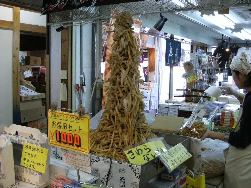 中には、高地名物の「芋けんぴ」屋で芋けんぴのタワーを作ってた店もあった。