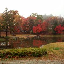 中央にはすずらん(鈴?)のモニュメントがあり、池面には色づいた紅葉の木々が