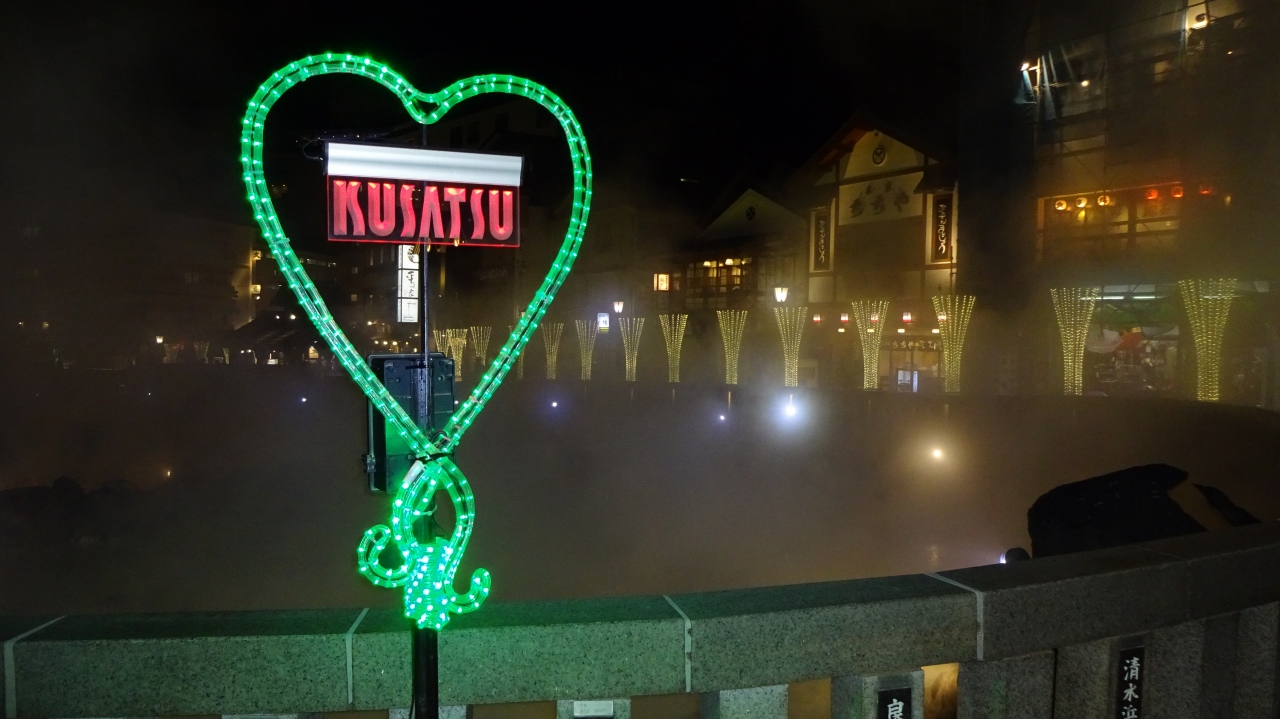 昼間は大混雑する湯畑ですが、夜のイルミネーション時はそれなりに落ち着いた雰囲気になります。