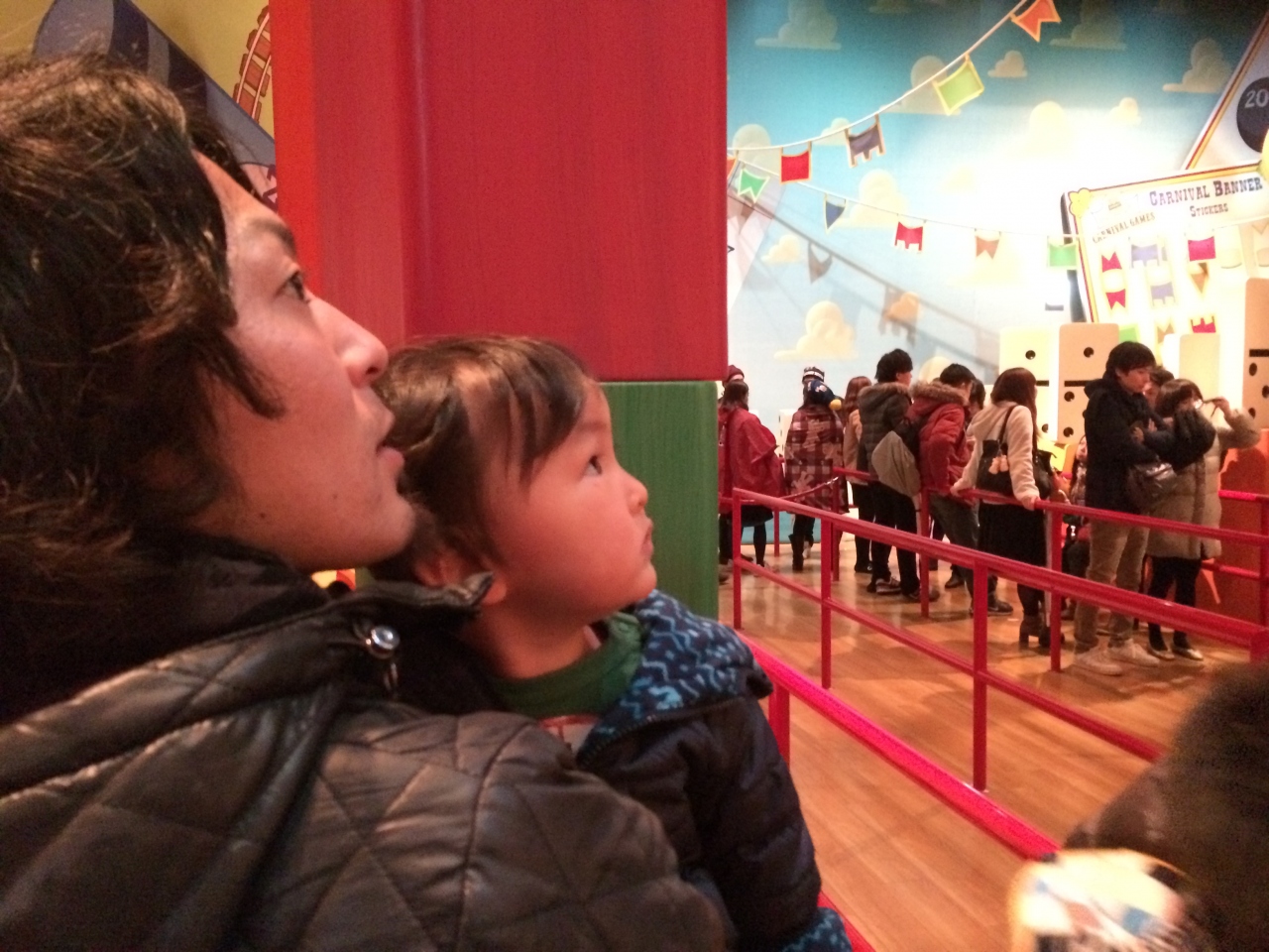 雨が降っている平日で8時オープンの9時頃にファストパス取りに行ったらすでに19時10分~の時間帯でした。のんびり取りに行ってたら発券終了になってたかも。一人で座っていられる子供なら乗れるということなので、2歳の息子と主人と人で乗りました。3Dのシューティングゲームなんですが、息子はまだよくわかっていないので私と主人で勝負したら意外とお互い本気になり盛り上がりました。息子は見てるだけでも楽しかったみたいです。