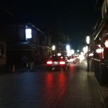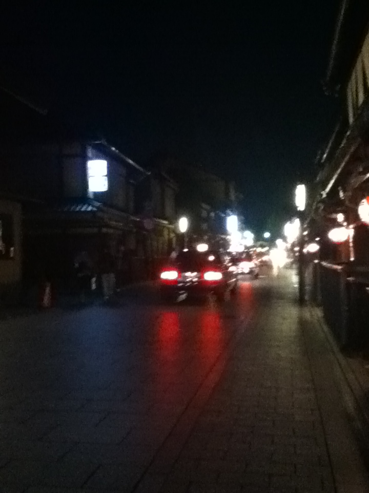 昼間に比べて夜の花見小路通りは、人気が少なくなるわけではないですが、大人の街といったちょっとものものしい雰囲気がありましたね。タクシーなどもわんさか通りますので、歩く際にはちょっと注意が必要です。舞妓さんはなかなか現れません。