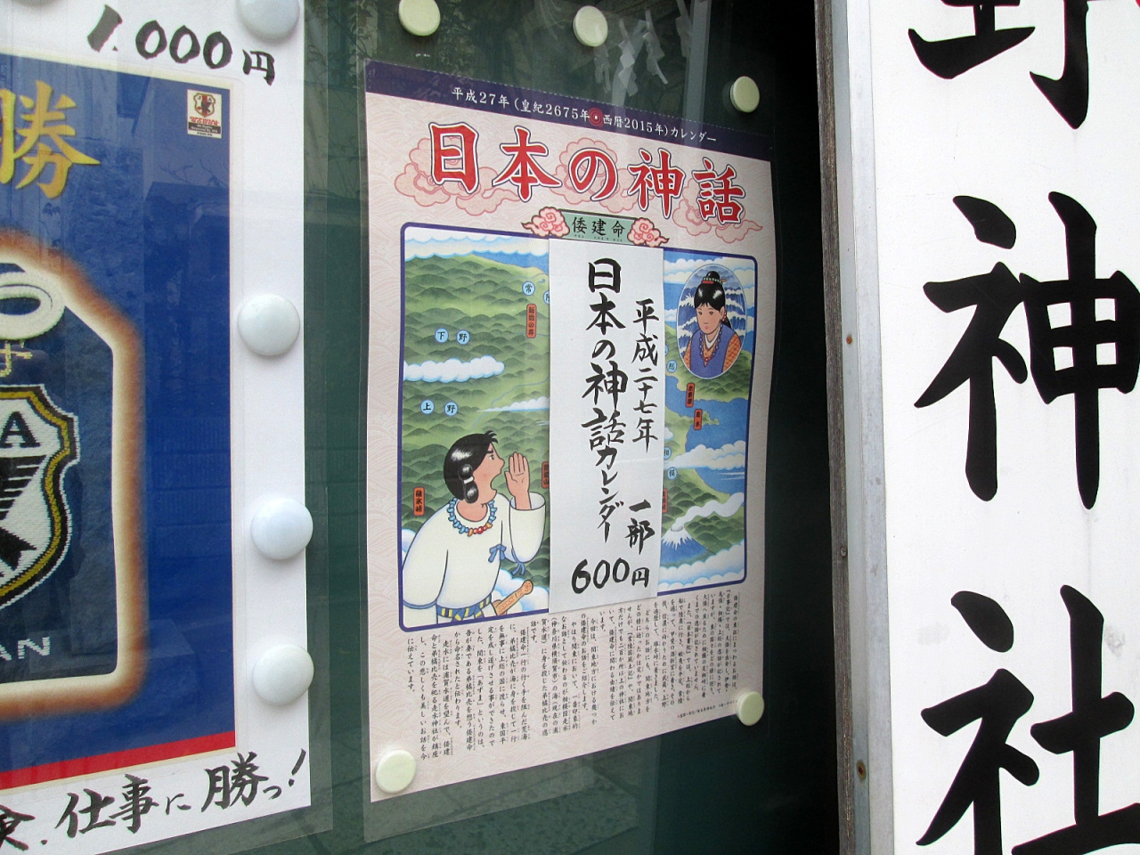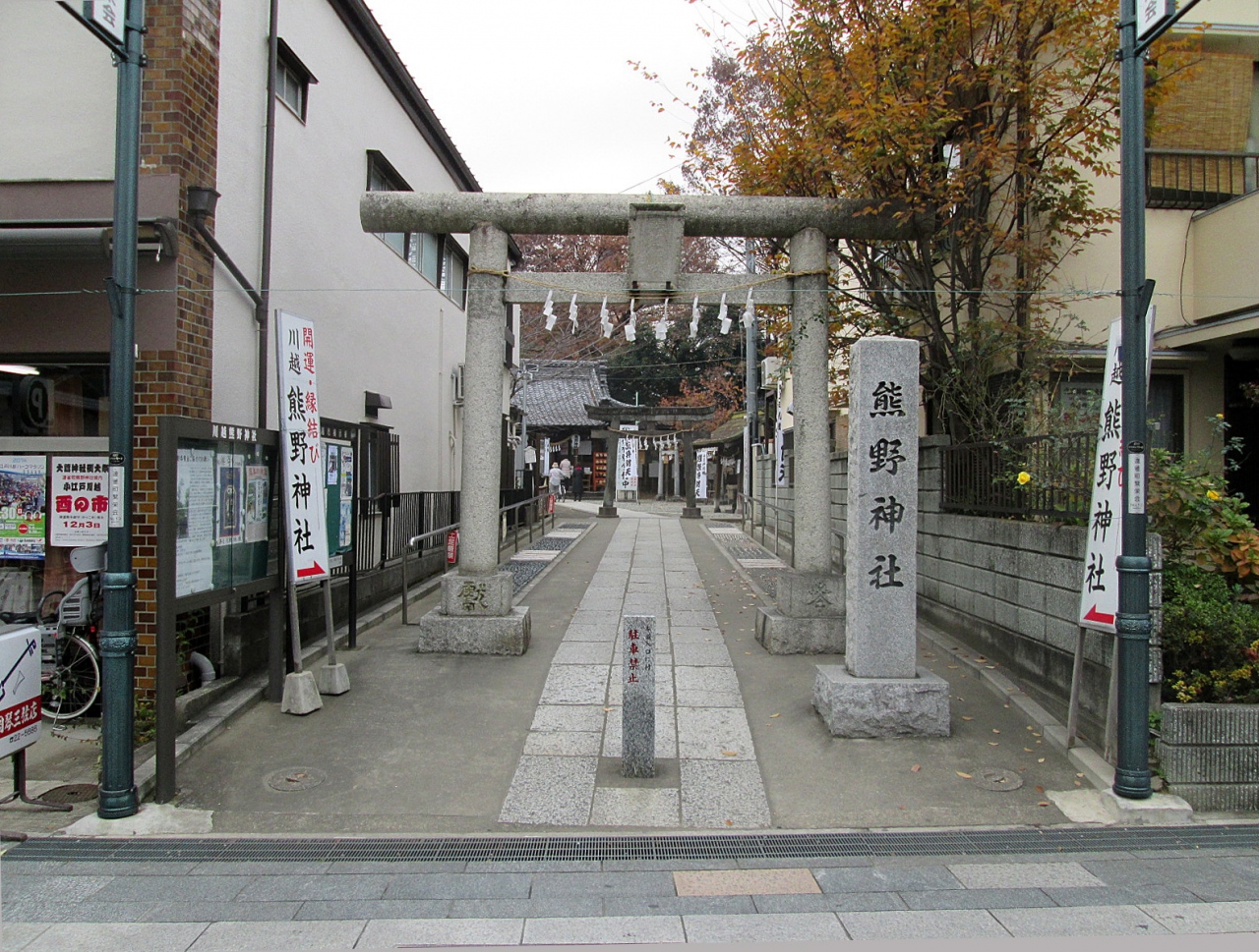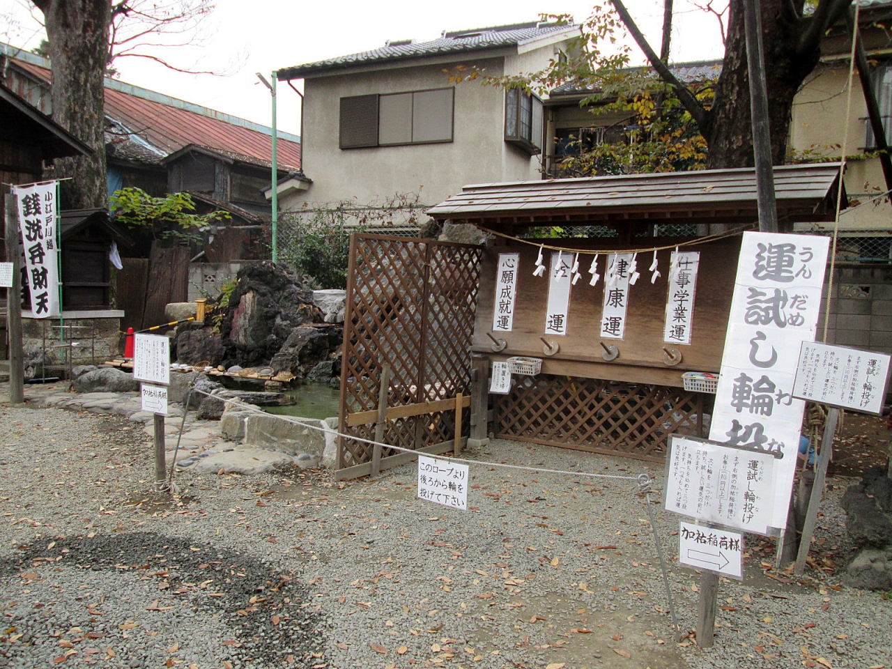 「熊野神社」という名前から私自身が想像していたのは、平安末期の院政時代に皇族・貴族によって熊野三山に建てられた神社ですから、少し形而上的な雰囲気を期待して境内に足を踏み入れたのですが、実際はまったく違ったものでした。鳥居をくぐると足つぼマッサージのできる”足踏み健康ロード”、壁には”日本の神話カレンダー1部600円”という広告、”運試し輪投げ”ができる「輪投げ舎」、境内には「銭洗弁財天」など世俗的に現世利益ばかりを願うものばかり。でも…これが本来の神社の姿であったのかもしれませんね。
