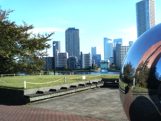 (鏡のように周囲を映す銀色の球体があり、自分を写して川面や対岸のビルと一緒に自分撮りがしやすいです)