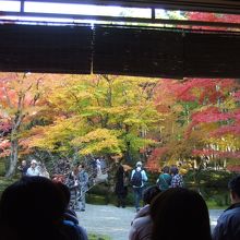 敷地内は紅葉一色で2つある家屋の中から庭園を見ると