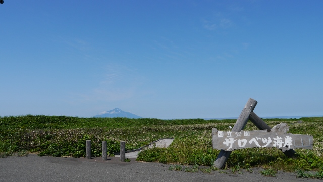 サロベツビジターセンターから海岸に向かって自転車で進むこと約25分。稚咲内海岸にたどり着く。海に向かって利尻富士、反対側はサロベツ原野の景色は大変きれい。また、交通量がほとんどない道路沿いにあり、観光客も全くいなかったため非常に静かな環境であった。