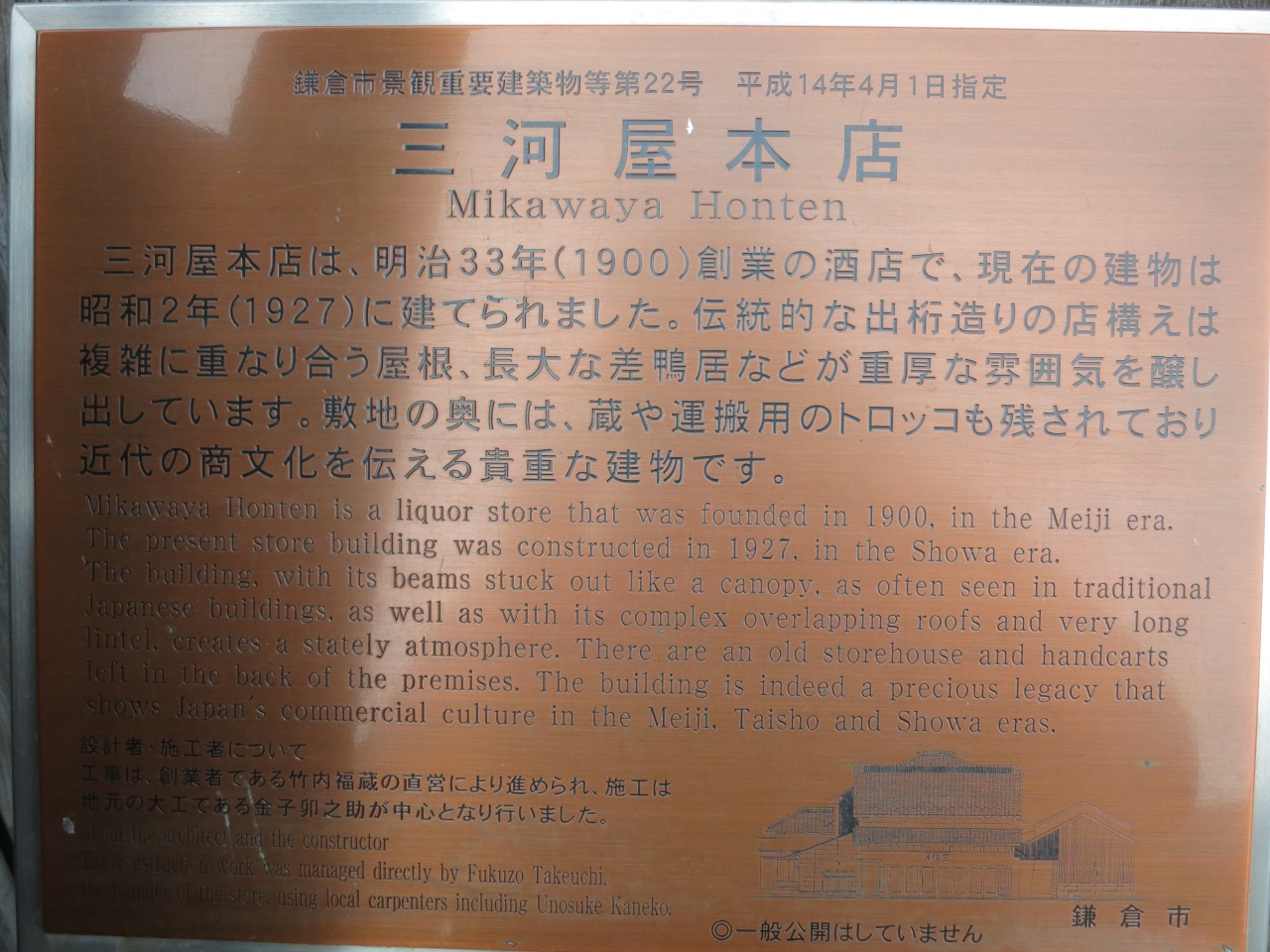 明治から続く酒屋さんで、戦前に建てられた酒屋建築が特徴的です。木造の母屋の北側には運搬用のトロッコ用レールが敷かれており、今でも使われており、テレビでも良く紹介されています。店内では日本酒は勿論、鎌倉地ビールも売っていて店頭で飲んでいる人もいて、私も飲みたかったのですが、車の運転があるので、鎌倉で採れた梅で作られた鎌倉梅サイダーを買い店頭で飲みました。甘くなく梅の味が強く美味しいです。