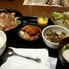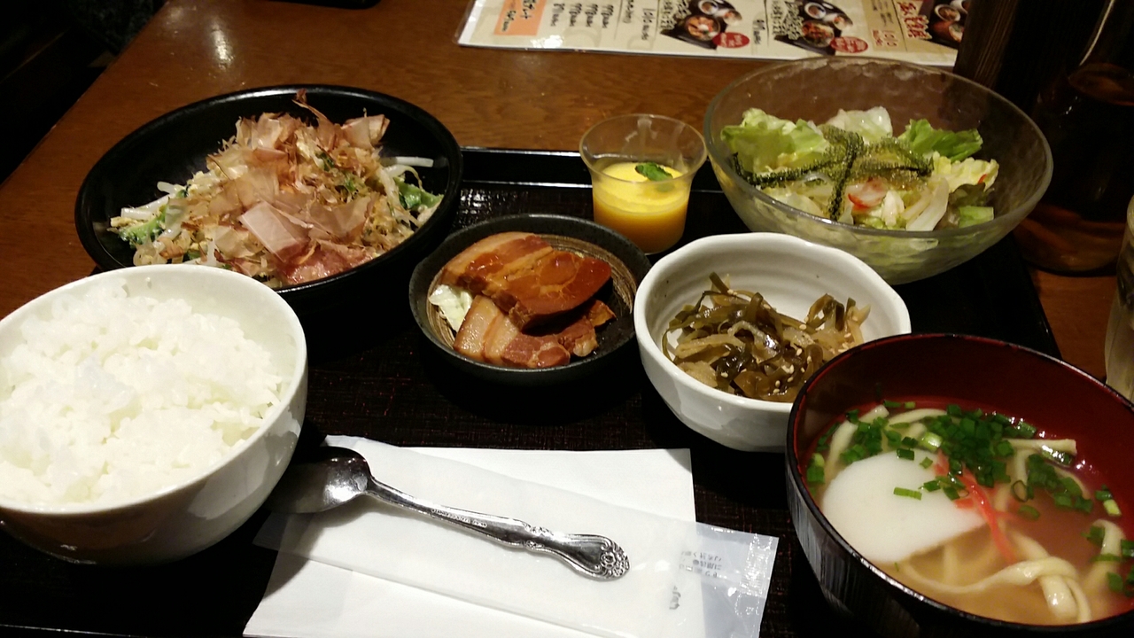 内容は、ゴーヤチャンプル、そーきそば、ラフテー、マンゴープリン、サラダなど。