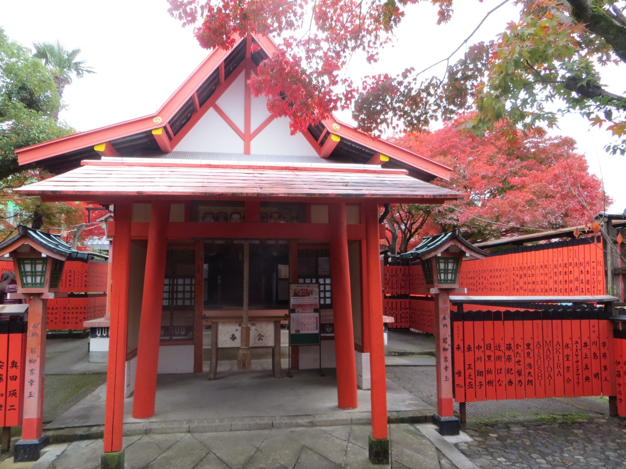 嵐電の車折神社駅南口を下車してすぐのところが車折神社。小さいですが嵐山に向かう途中の人気の観光スポットの一つです。雑誌等で紹介されているので年々観光客が増えているように感じます。特に修学旅行生や女性の団体客に人気のよう。芸能神社は車折神社の境内にあります。朱色の玉垣に囲まれていて芸能人の名前が多く見られます。11月下旬ここも紅葉が真っ盛り。