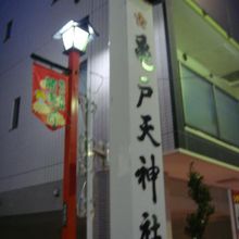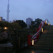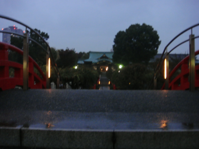亀戸天神社に着いたのは4時半ごろ、あいにくの雨だったため境内には参拝者は私だけ、ちょうど菊まつりの展示の後かかたずけの最中でした。拝殿に向かって左側には、「牛」が鎮座していますが、暗いと不気味なものです。お参りを終えて、社務所へ御朱印を頂きに行きましたが、快く書いていただきました。帰り際に振り向いたら、スカイツリーが社殿の背後に控えてきれいでした。