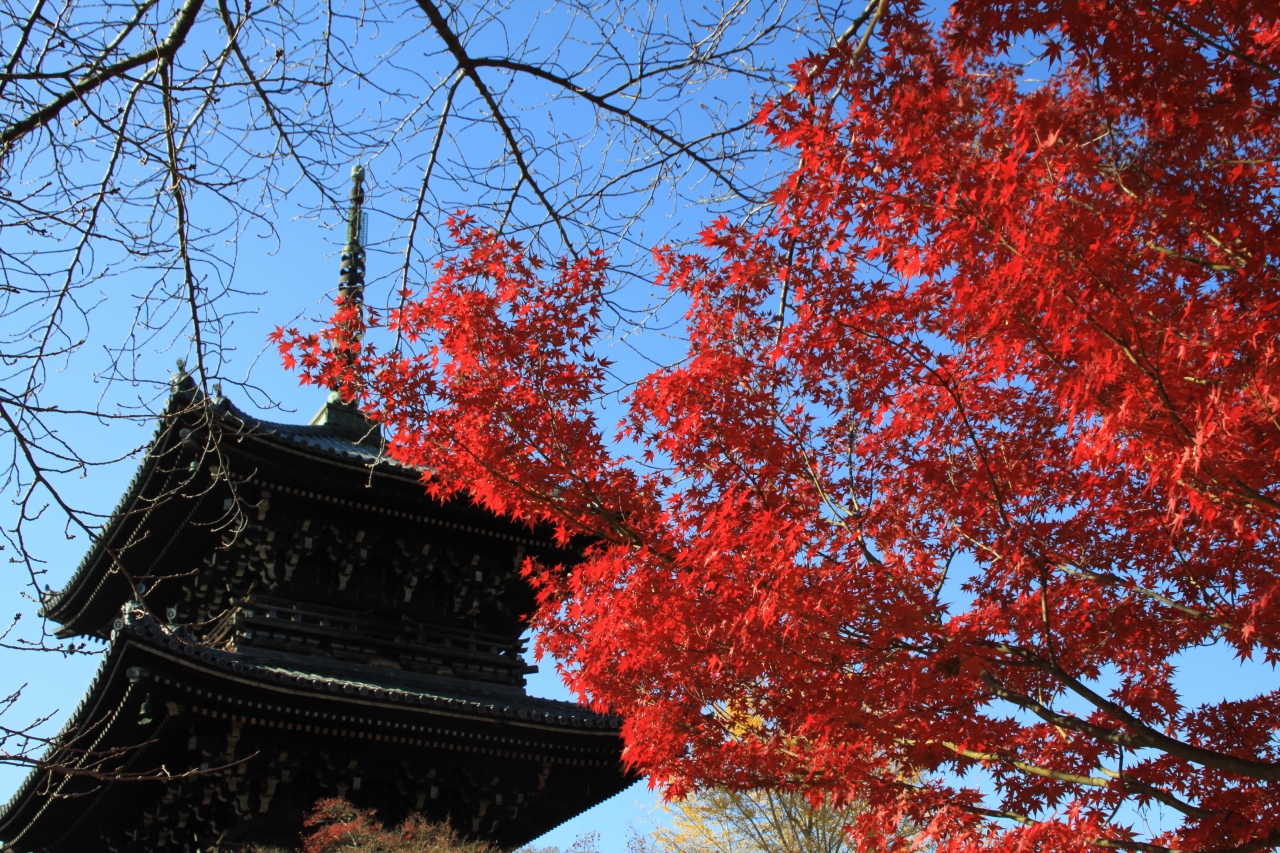 石畳の参道を歩くと、両側には大きなカエデが赤く染まり、奥には三重塔が見え、塔の黒と赤のもみじとのコントラストは最高です。また本殿裏手のもみじも素晴らしく、散策するのにも絶好の場所です。時間帯を考えれば、拝観料も要らず、落ち着けるもみじの名所です。