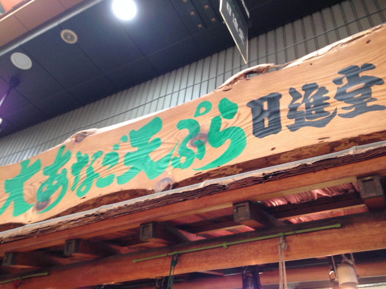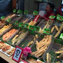 黒門市場の中にある揚げたて天ぷら屋さんです。看板に「大あなご天ぷら」と謳っていますが、それ以外の天ぷらもたくさん並んでいます。皆さんたくさん買ってらっしゃいました。私たちはそのほかにも食べ歩きしたかったので、とりあえず大あなご天ぷらといわしの天ぷらを購入してその場で食べられるようにしてもらいました。