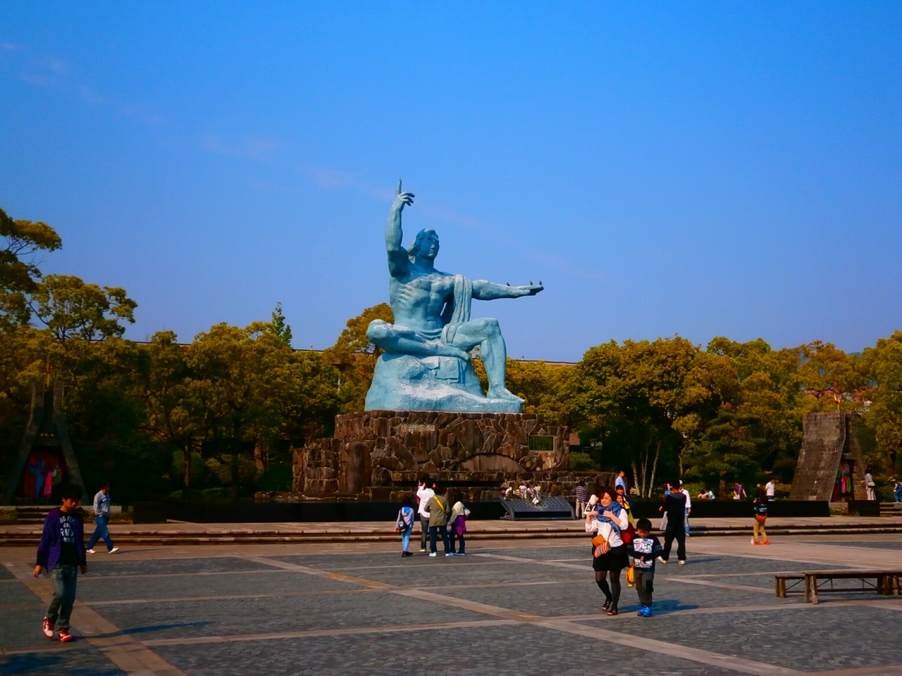 長崎原爆資料館のすぐ隣にあります。とても大きな公園でした。さらにお散歩しているひとが多かったです。平和公園の中にはいろんな銅像があります。春はこの公園の花がとてもきれいでした。そして座る場所がたくさんあります。
