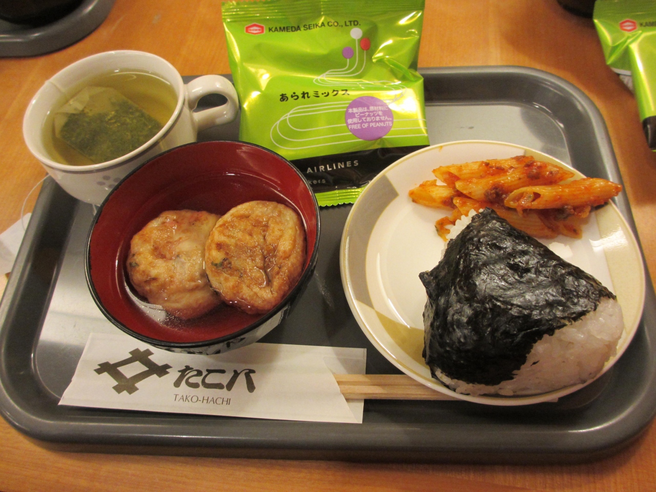 さくらラウンジも各空港によってサービスの内容はまちまちだが関西空港のラウンジには土地柄かたこ焼きがある。日によっては品数が少なくなっているときもあるが今回はお代わりして食べることが出来た。他にスープやおにぎり、クッキー、おつまみもあり出発前のひと時を楽しめる。