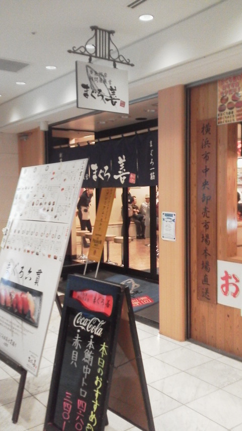 横浜駅東口方面に向かっていくと必然的に入り込んでいく、地下街ポルタ のB1Fにある回転寿司屋さんがここ「魚河岸 鮪問屋直営 まぐろ善」。店構えがオープンの感じがしたので、ちょっと立ち寄ってみるかって感じではいりました。今回は、本マグロの中トロというお奨めもあったのもラッキーでしたね。いろんなネタで満腹というよりは、適度に味わいながらランチ時のひと時を過ごすことができました。寿司屋さんでは、その時の予算や気分、食べられる時間、ロケーションなどに応じてお店の種類を選びますが、今回のケースは適度の予算範囲内で満喫できました。特にまぐろ好きにはよかったですよ。