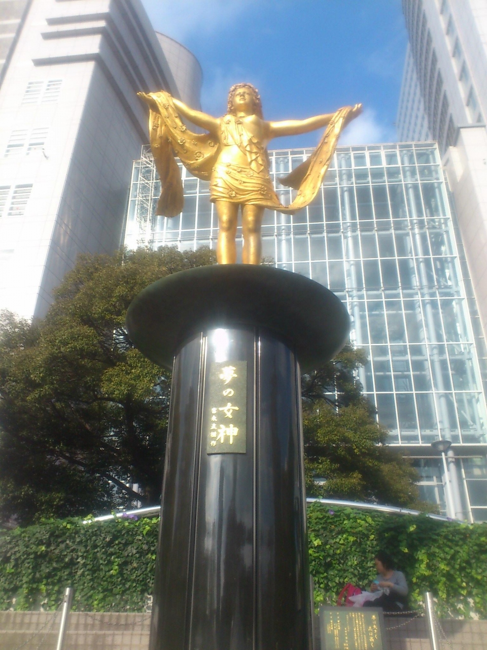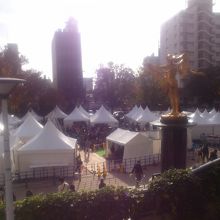 名前どおり矢場町にある公園で地下は駐車場になっています。ナディアパークの目の前にあります。この日は何かのイベントをやっていて、公園の中はテントだらけで、中に入ることはできませんでした。公園からナディアパークへ行く階段のところに、金色の像が立っています。