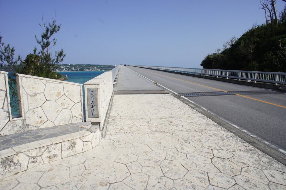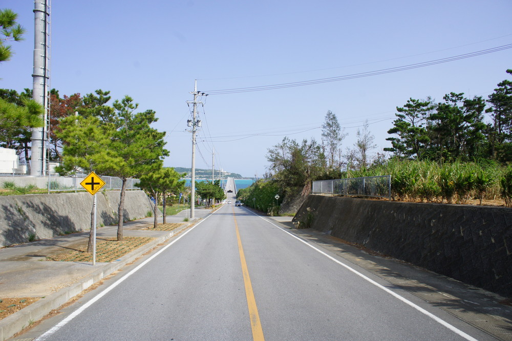 また、屋我地島からこの橋へ差し掛かる道は、ちょっとだけ上り坂になっていて、登り切ったところでパっと視界が広がり、古宇利大橋が見下ろせます。