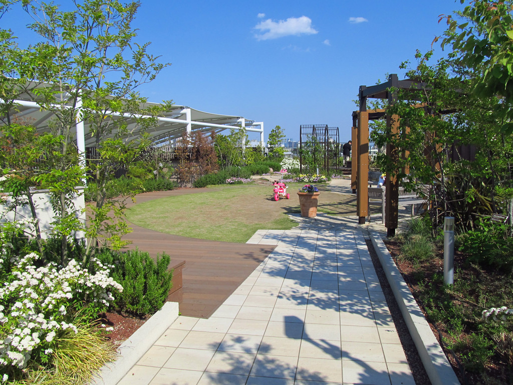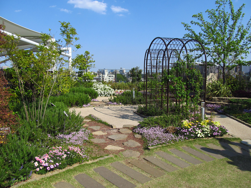 屋上に造られているのでとてもコンパクトな体裁ですが、草木や花は多いですし、眺望もまずまずで、くつろげる空間になっていると思います。