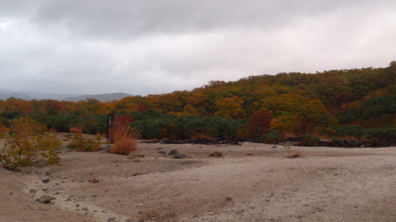 足元からも小さい硫黄がふつふつと吹き出している様子が見れました。丁度紅葉の時期だったので白い煙と紅葉もなかなかのものでした。