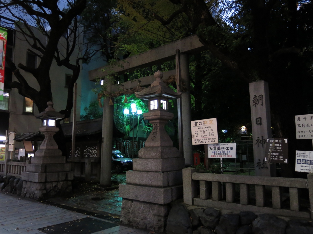由緒書きによると、1611年、名古屋城が出来たとき、徳川家康公の請願により、清洲城下からこの地に移築されたとか。繁華街の大きな通り沿いにあるので、夜でも灯りに照らされ、名古屋の町を守っている感じを受けます。境内には、銀杏の木があり、夜灯りに照らされた紅葉が印象的でした。境内は結構広く、お稲荷さんもありましたよ。