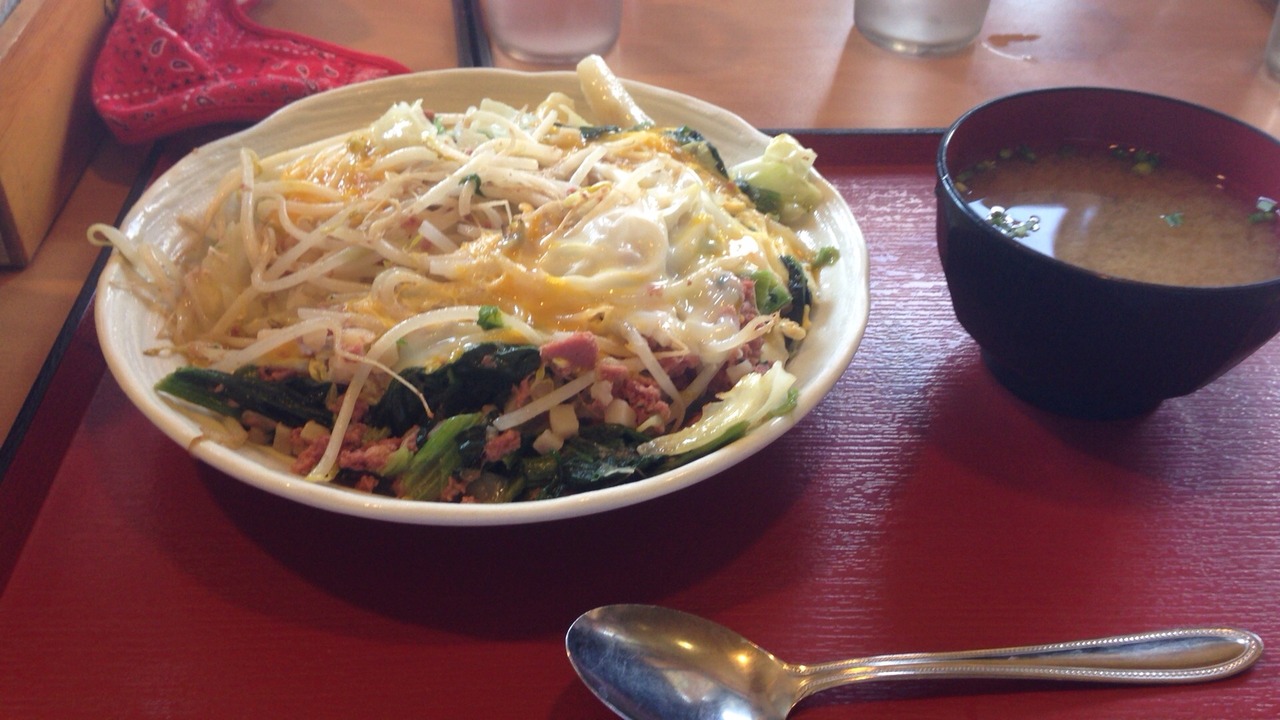 沖縄ではちゃんぽんは麺ではなく、野菜、ひき肉、スパム等を卵とじにし、ご飯に乗っけたどんぶりです。