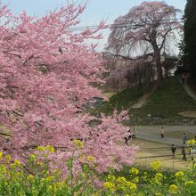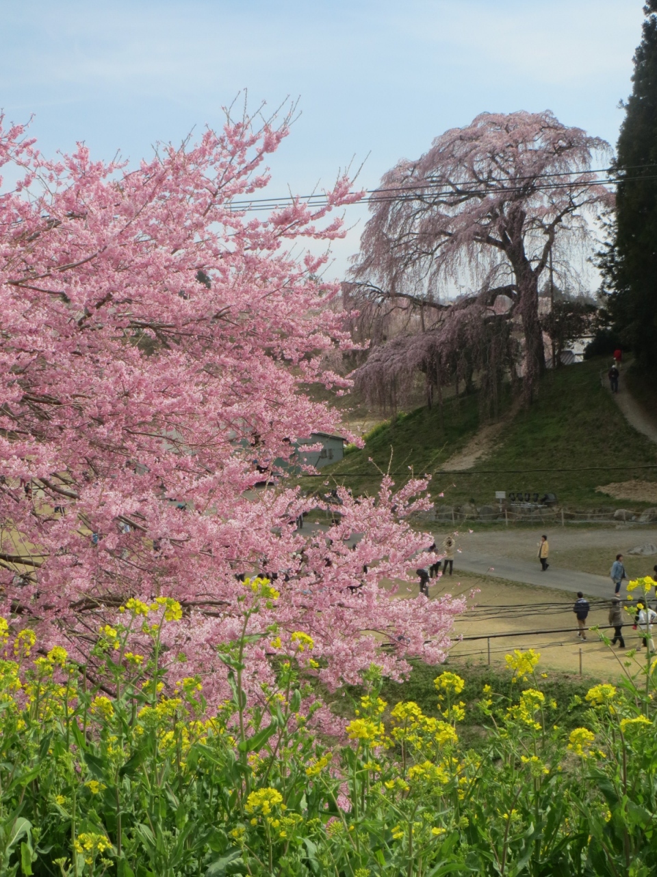 手前の土手の菜の花の黄色とコントラストが美しいです。