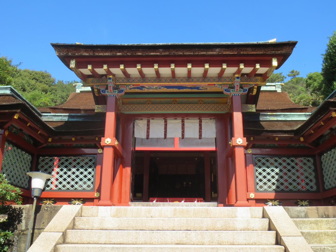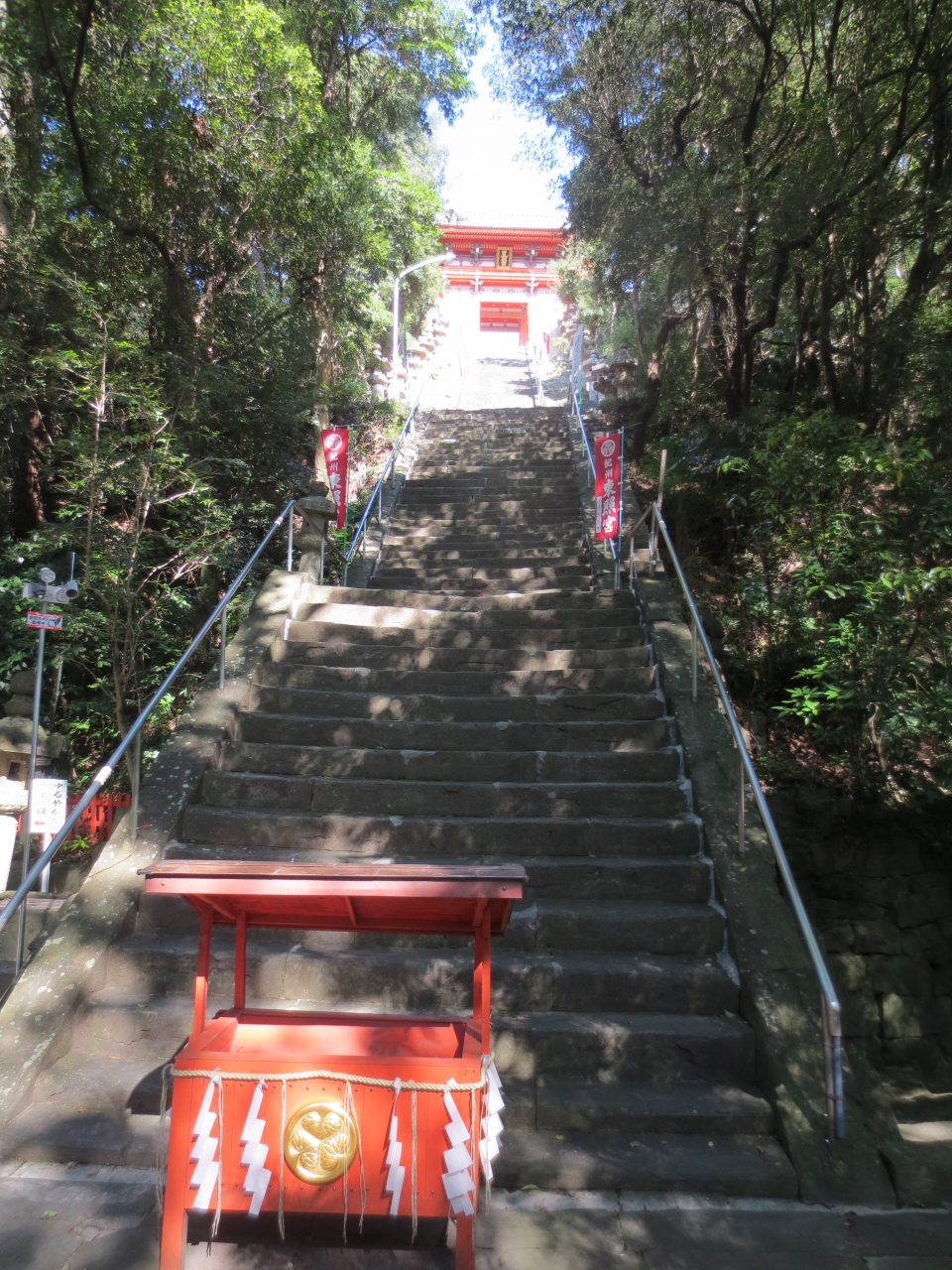 鳥居をくぐると緑に囲まれた長い参道が続きます。木漏れ日があふれ参道を歩いてるだけで厳かな気分になります。その先にある急で長い階段を上ると本殿があります。