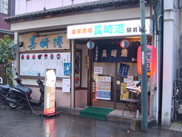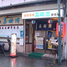 長崎市の玄関であるJR長崎駅前のにぎやかな市街地に立地する飲食店。「海鮮市場」を名乗り、新鮮な魚を使った料理が得意です。市内に何店舗かあるうちの駅前店で、列車の時間に合わせて食事ができます。海鮮丼は具がぎっしりです。