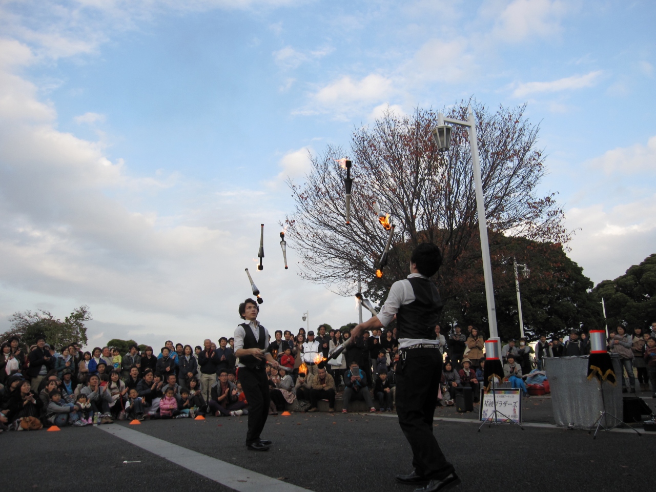私が見たのは世界大会で準優勝経験ありという二人組で、道具はシンプルながら技は凄かった。