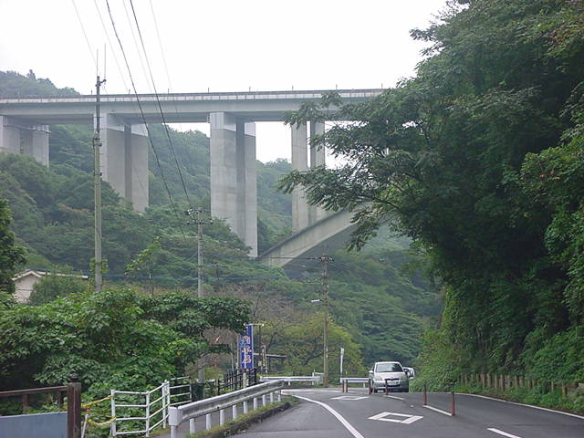 地獄めぐりの中心となる鉄輪から、明礬温泉に向かって山を登る途中。大分自動車道の明礬橋があります。あちこちに湯けむりが上がる明礬温泉を一跨ぎしている大きな橋ですが、建築物としても立派で、美しいアーチが印象的です。